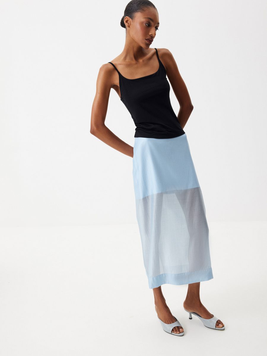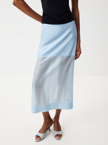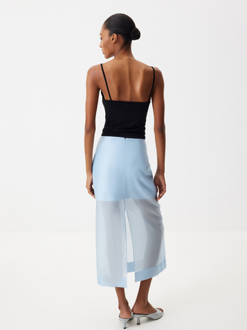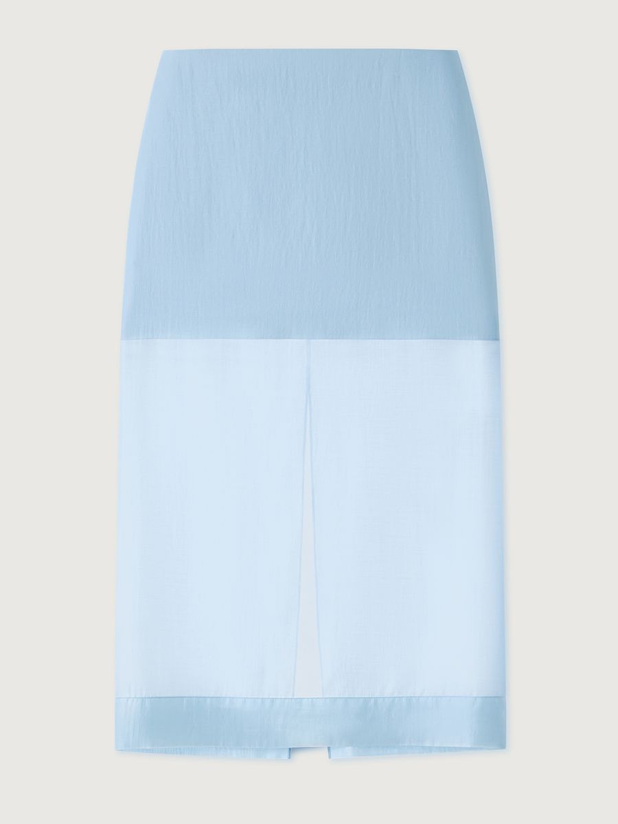 Прямой силуэт со слегка заниженной посадкой. Застежка на потайную молнию на спинке. Высокий разрез сзади. Широкая подгибка по низу изделия. Подкладка — мини из атласа.