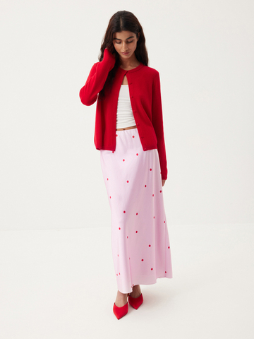 Кардиган Red Rose — выразительная база, стирающая грань между повседневным гардеробом и модными аутфитами. Лаконичная модель в чувственном красном цвете дополнена аккуратным круглым вырезом, обтяжными пуговицами в тон и тонкими манжетами. Пряжа из шерсти мериноса комфортно согревает и нежно касается кожи — уют, с которым вам не захочется расставаться. Выбираем низ по настроению: мягкую юбку из сета или кокетливую модель в горошек Sweetly Dots.