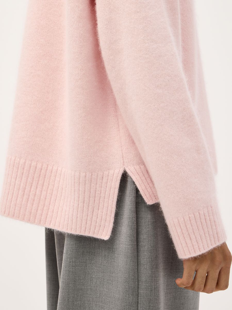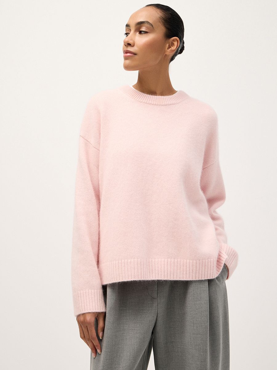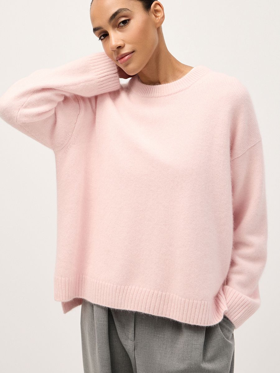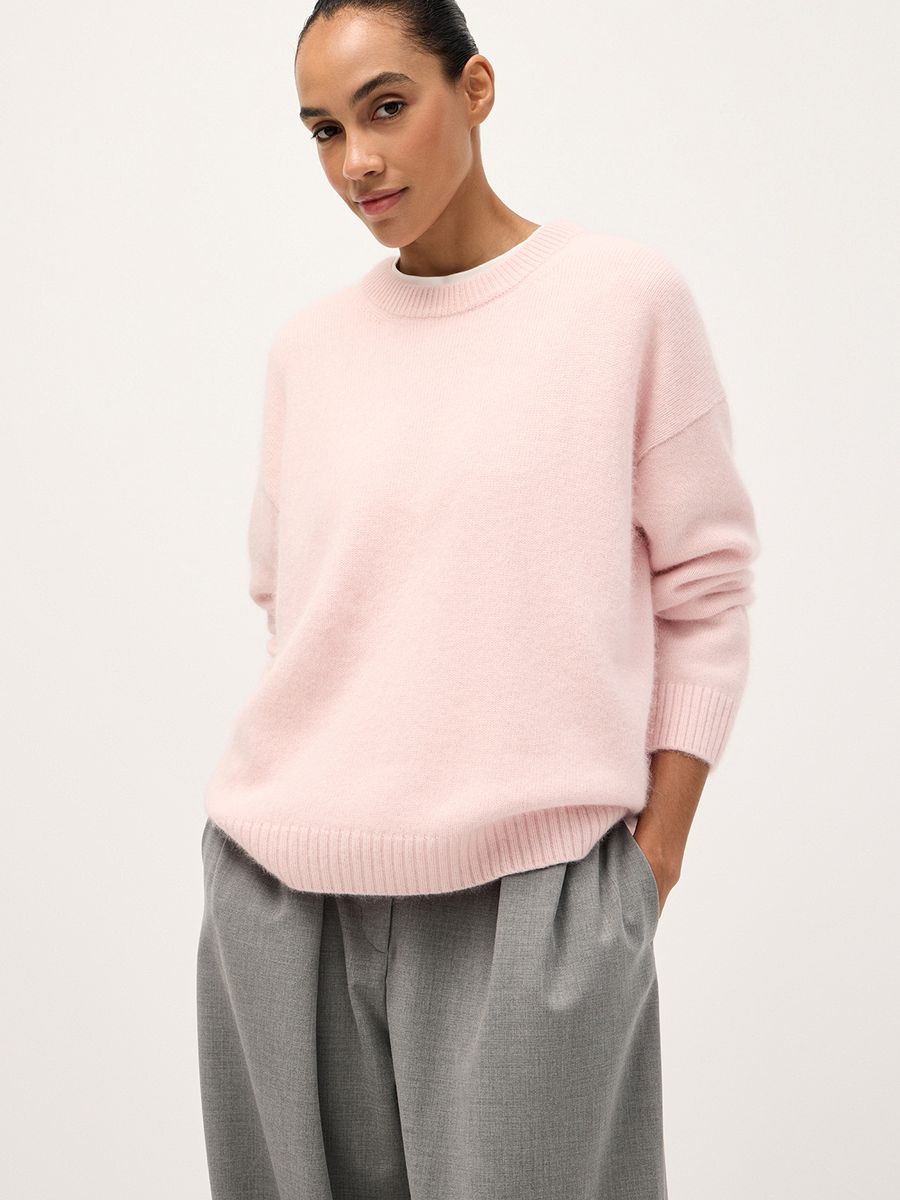 Объемный джемпер Merino Essential — нежность и уют, которые хочется выбирать каждый день. Расслабленный крой со слегка удлиненной спинкой идеально подходит для многослойных образов с рубашками и водолазками, которые так актуальны в холодном сезоне. Роскошная пряжа с шерстью енота и мериноса дарит мягкие прикосновения и бережно согревает, а пастельно-розовый оттенок выразительно контрастирует с осенне-зимней палитрой и городскими пейзажами. Носим универсальный джемпер с любым низом: от классических джинсов и фактурных юбок до трендовых брюк-аладдинов.