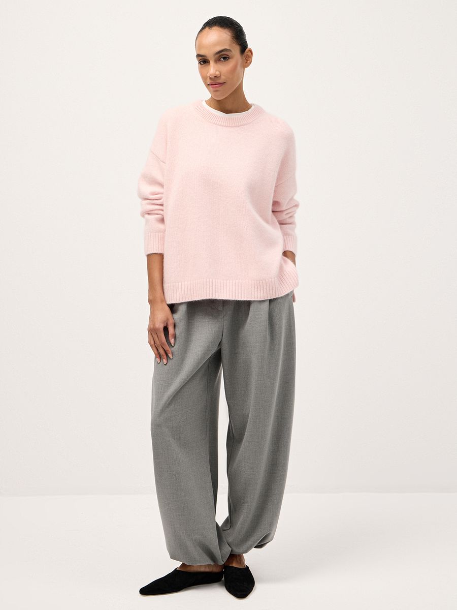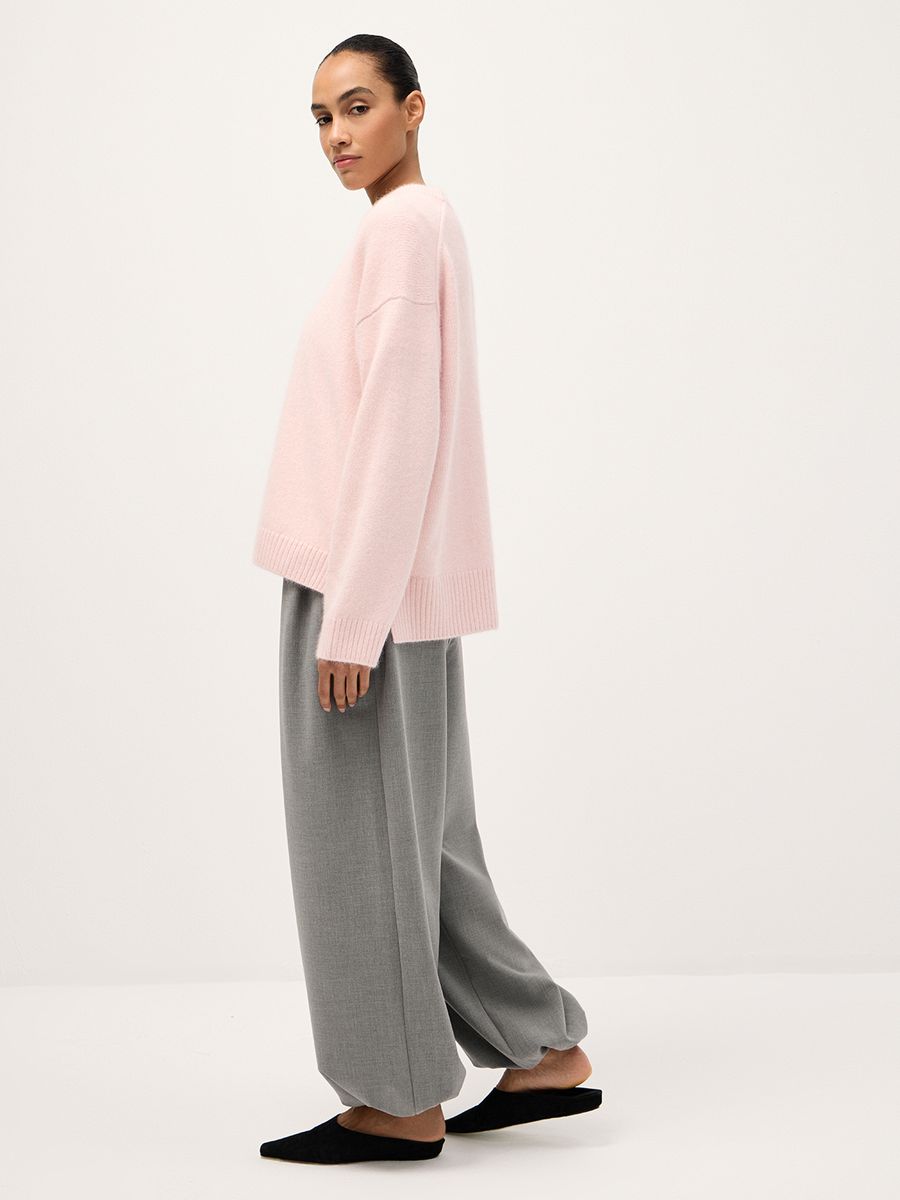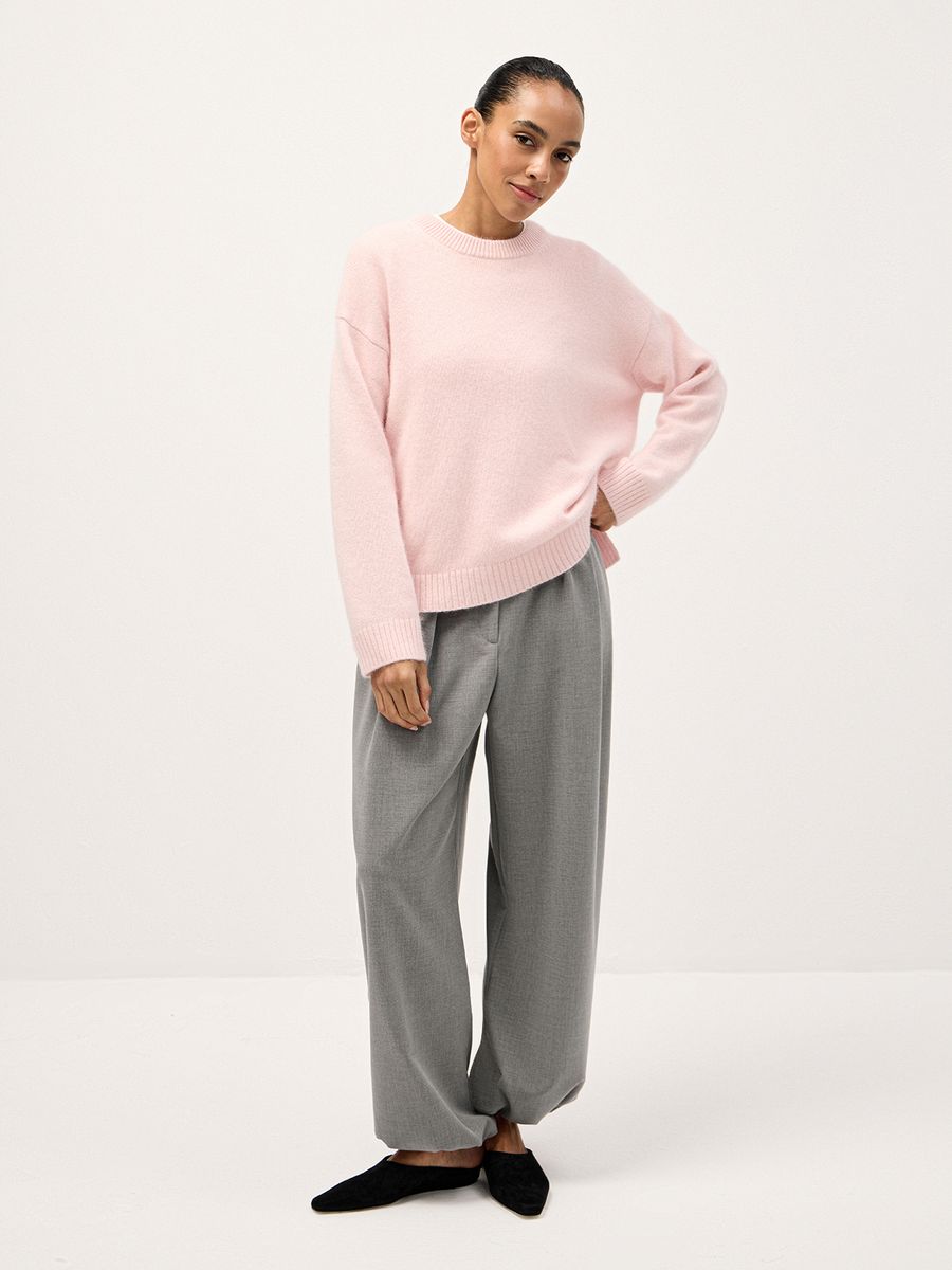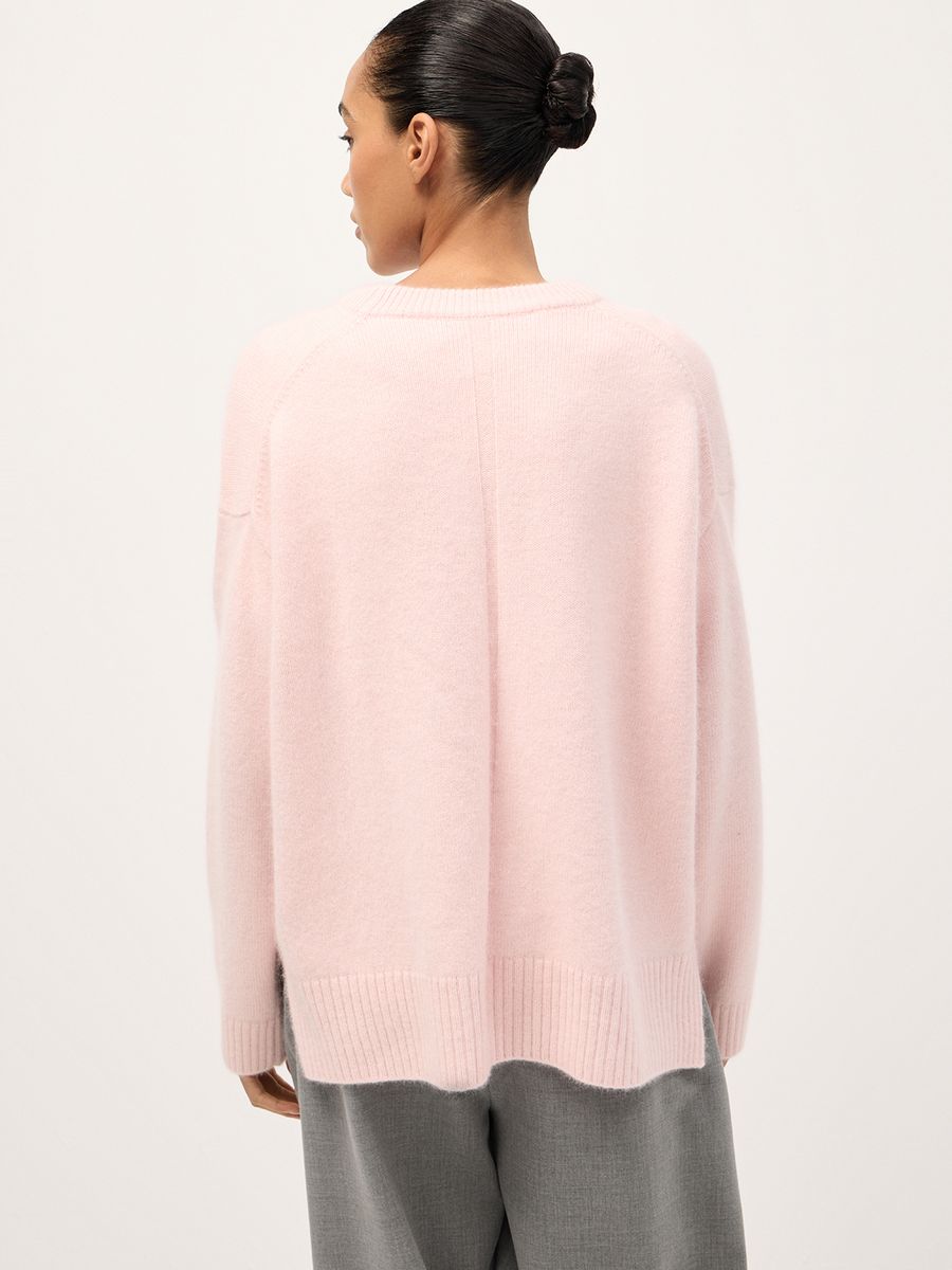 Объемный джемпер Merino Essential — нежность и уют, которые хочется выбирать каждый день. Расслабленный крой со слегка удлиненной спинкой идеально подходит для многослойных образов с рубашками и водолазками, которые так актуальны в холодном сезоне. Роскошная пряжа с шерстью енота и мериноса дарит мягкие прикосновения и бережно согревает, а пастельно-розовый оттенок выразительно контрастирует с осенне-зимней палитрой и городскими пейзажами. Носим универсальный джемпер с любым низом: от классических джинсов и фактурных юбок до трендовых брюк-аладдинов.