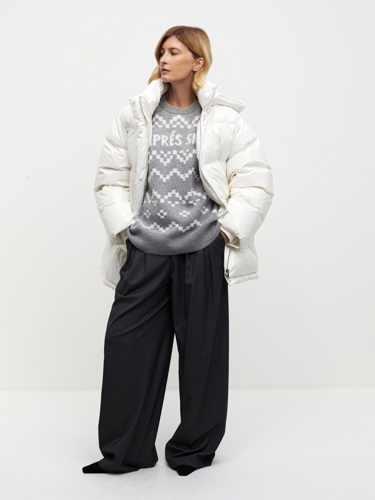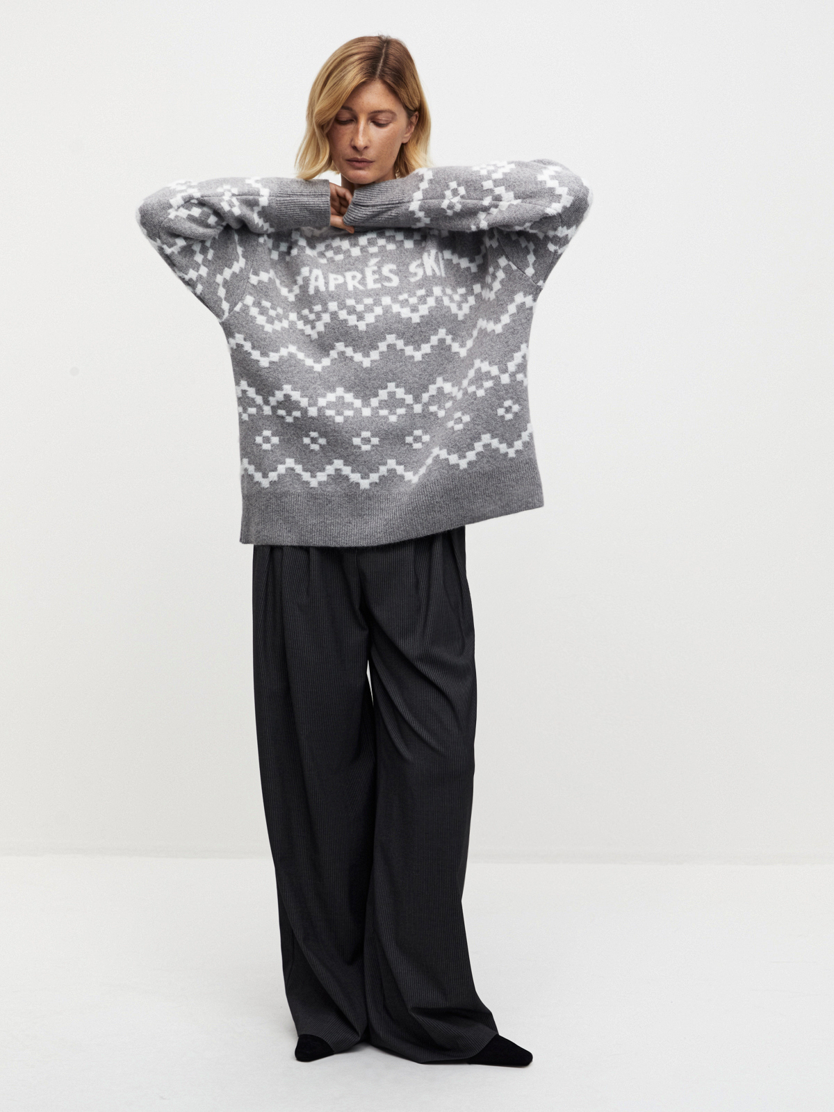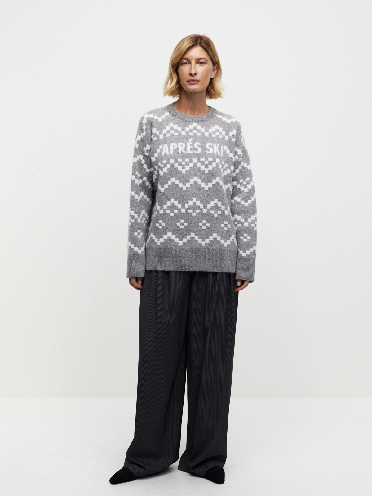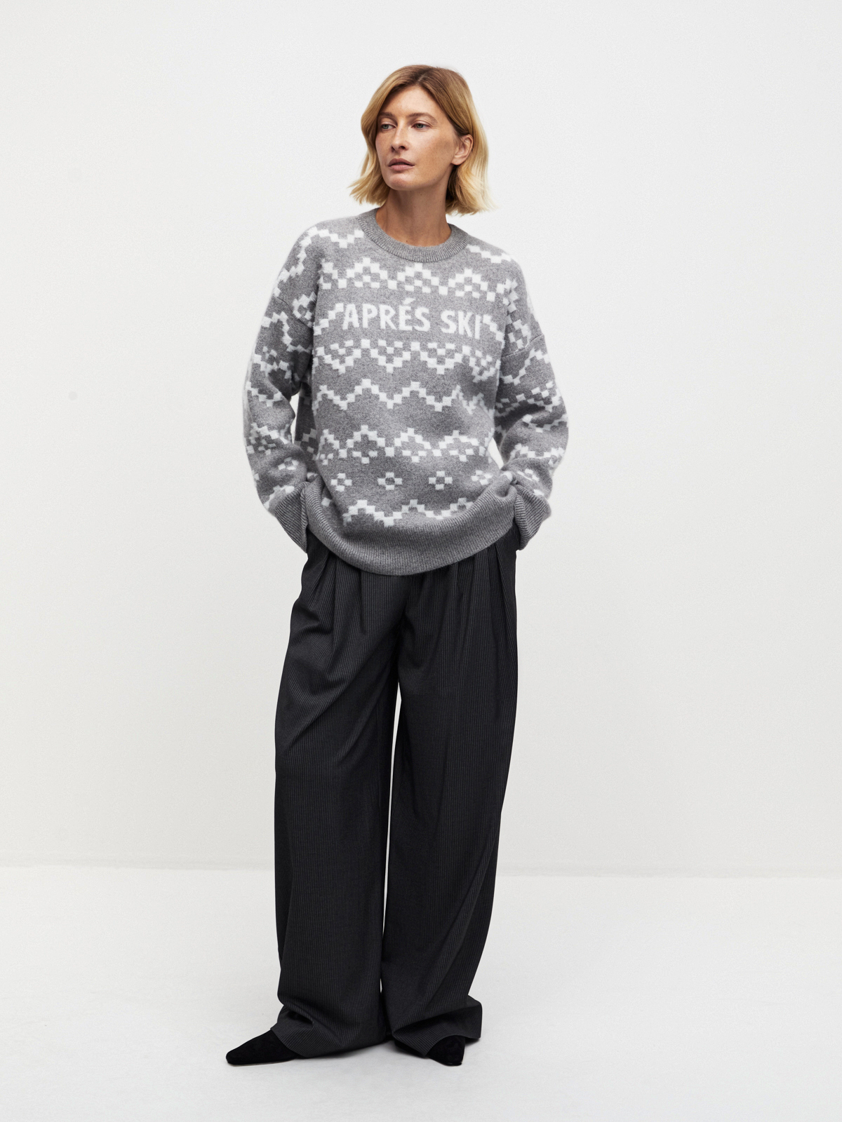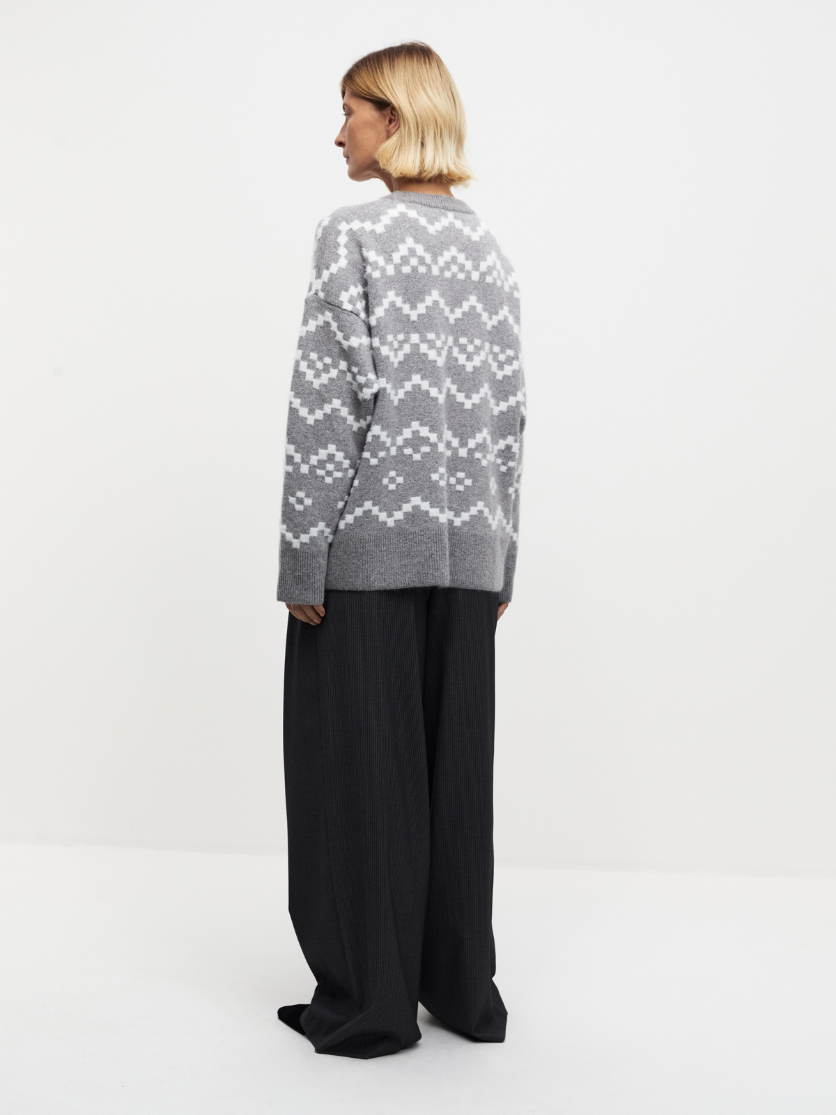 Джемпер в оттенках серого с нордическим узором — идеальное воплощение базовой зимней классики. Вдохновленный атмосферой зимних курортов и снежных склонов, он создаёт настроение après-ski сдержанно и с ноткой ретро. Теплый и уютный джемпер, который легко сочетается как с джинсами, так и с более формальными элементами гардероба, добавляя в ваш образ отголоски альпийской прохлады.