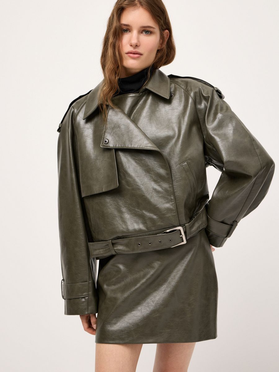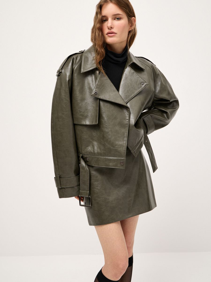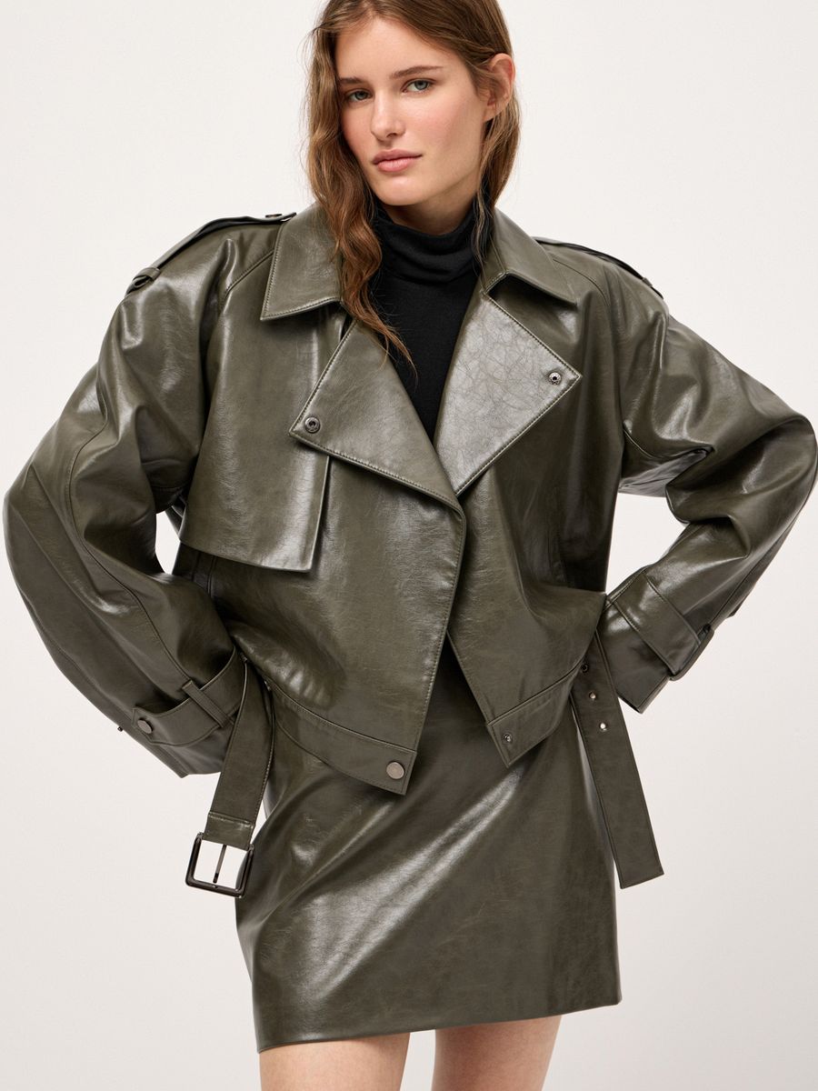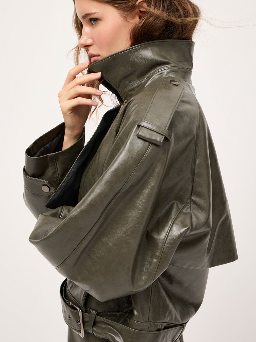 Массивные лацканы, ремни на манжетах и поясе — все это отсылает к яркой эстетике 80-х, когда смелость и харизма были основой образов. А укороченный oversize силуэт придает куртке вневременной актуальности.