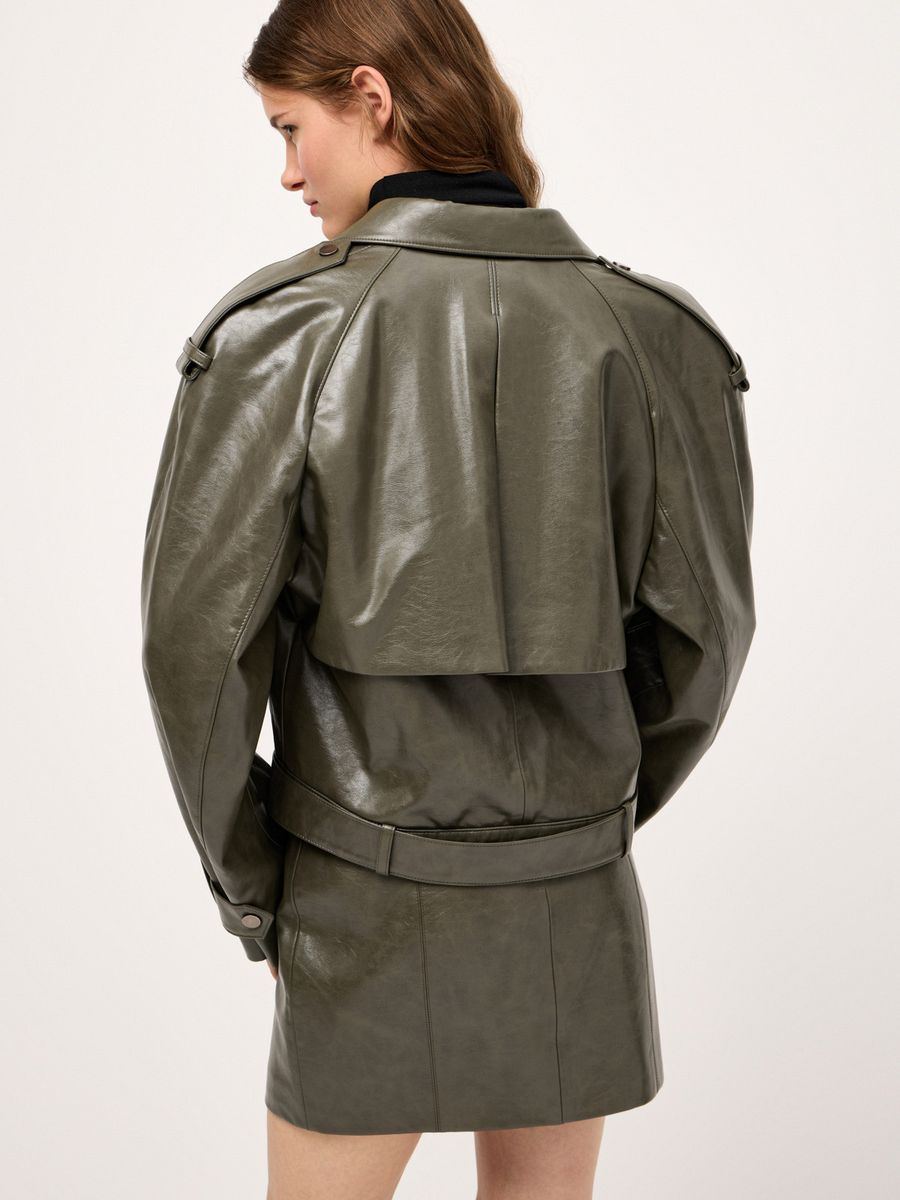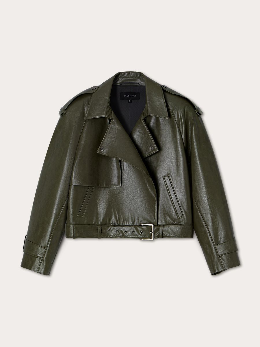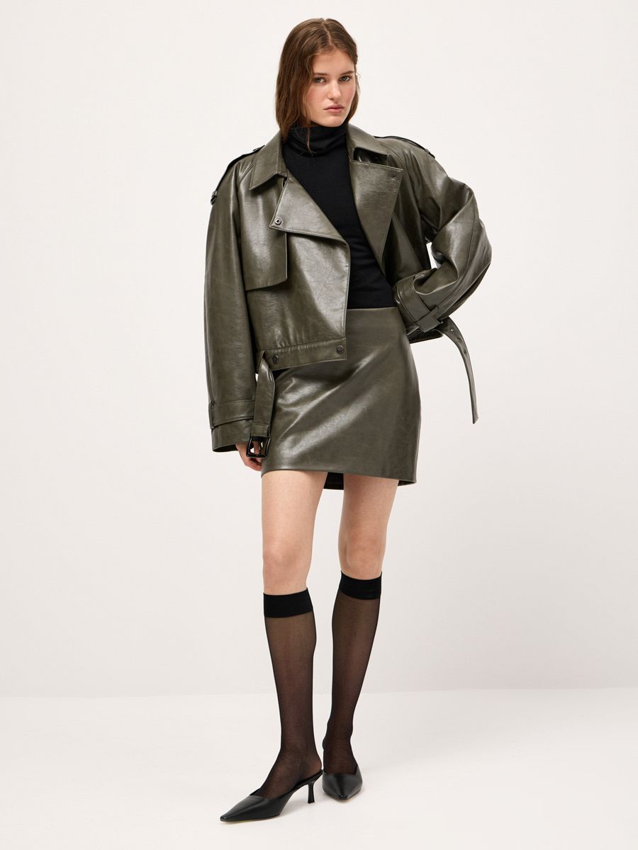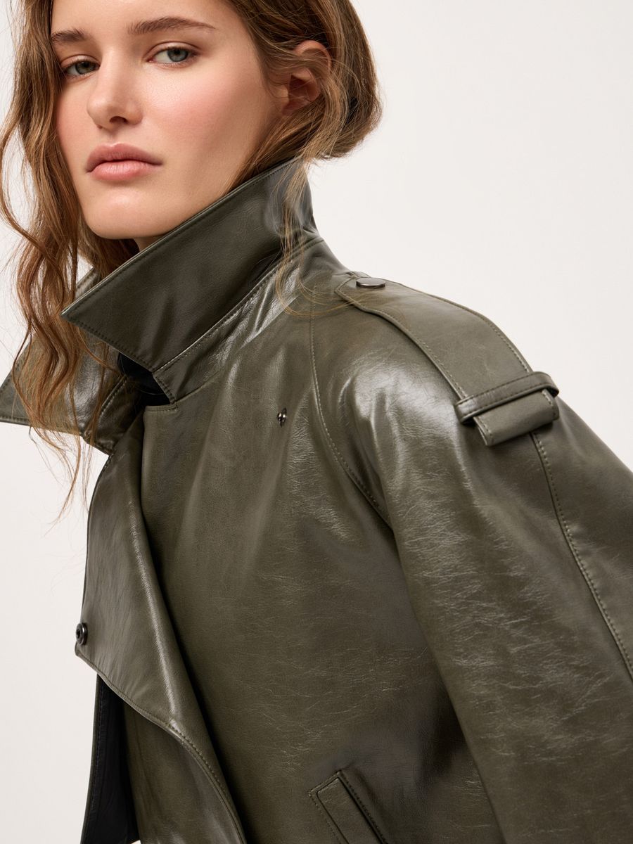 Массивные лацканы, ремни на манжетах и поясе — все это отсылает к яркой эстетике 80-х, когда смелость и харизма были основой образов. А укороченный oversize силуэт придает куртке вневременной актуальности.
