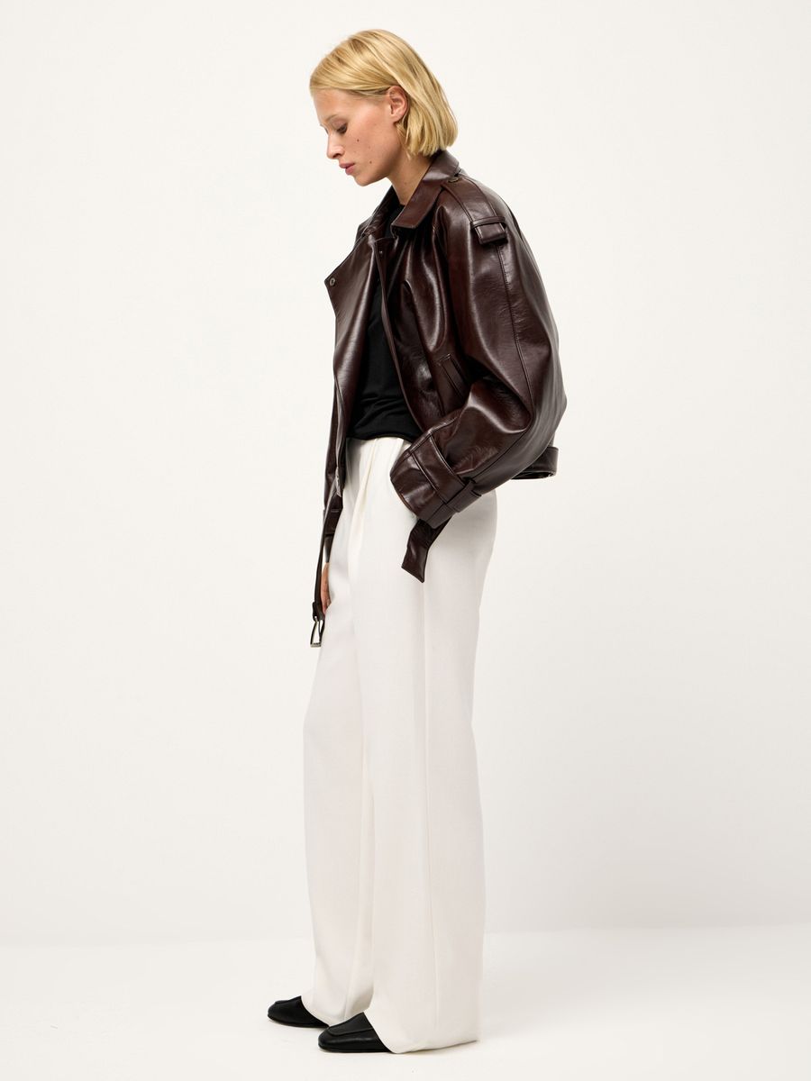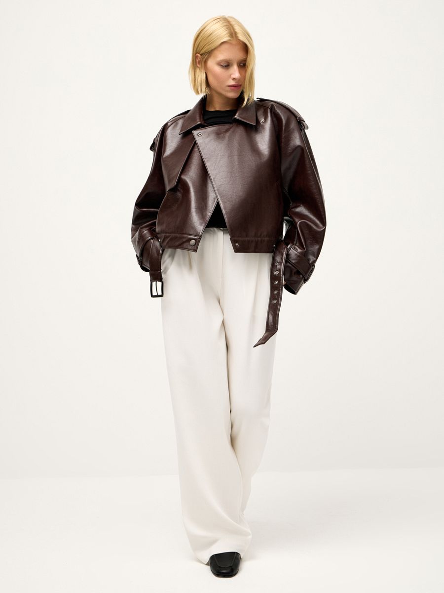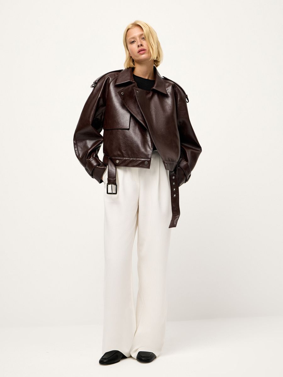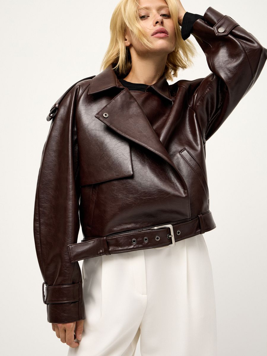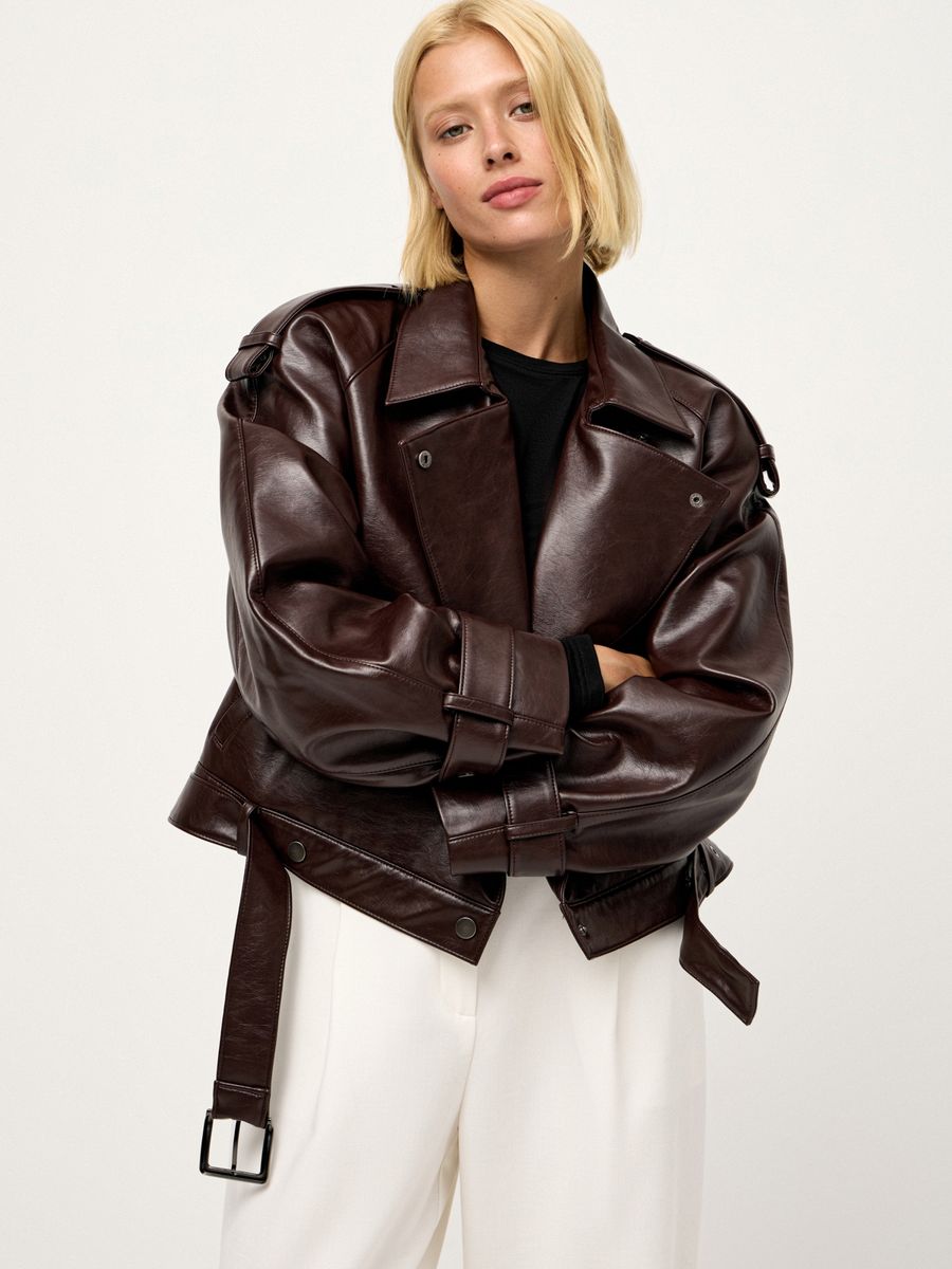 Массивные лацканы, ремни на манжетах и поясе — все это отсылает к яркой эстетике 80-х, когда смелость и харизма были основой образов. А укороченный oversize силуэт придает куртке вневременной актуальности.