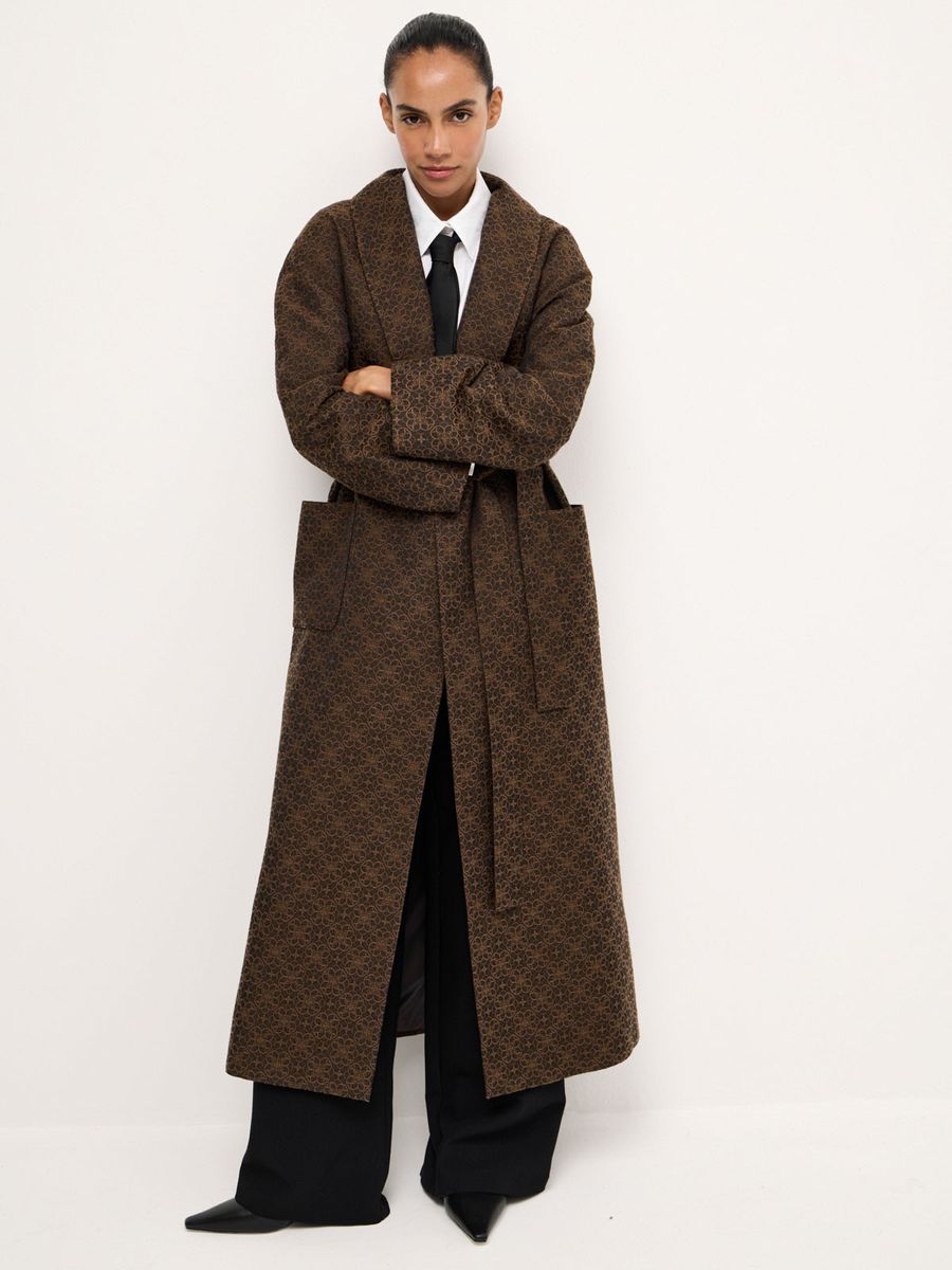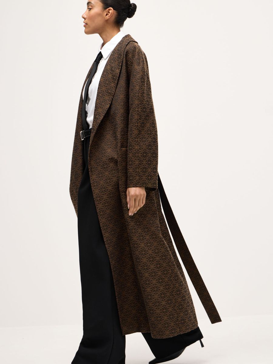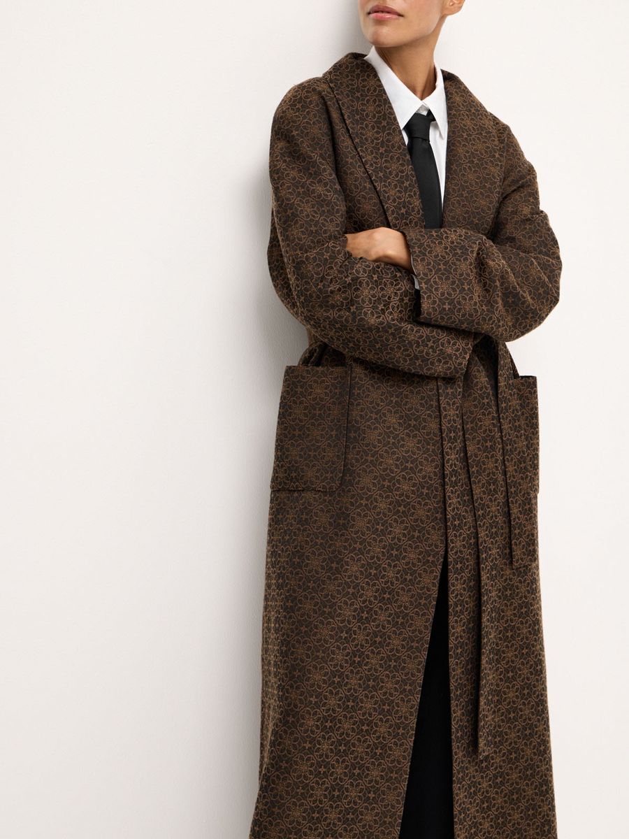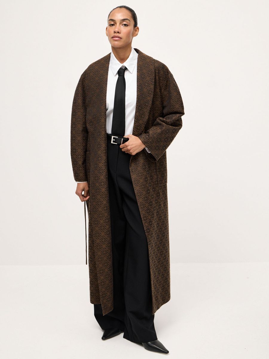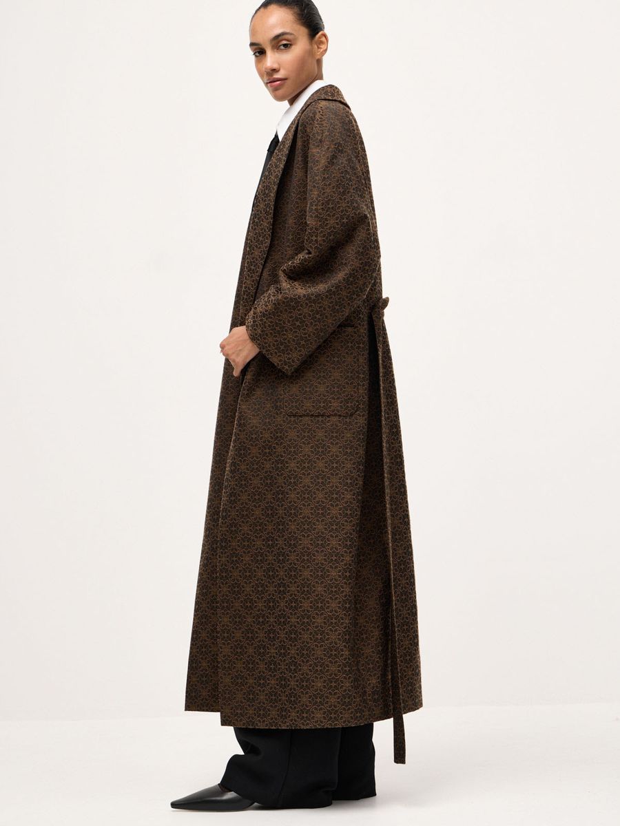 Этот тренч-халат словно создан для сценария, в котором вы — главная героиня. Плотная струящаяся ткань с деликатным орнаментом отсылает к гардеробу женщин, которые легко управляют своим ритмом жизни — будь то рабочий завтрак, поздняя встреча в офисе или путь из галереи в любимый ресторан.