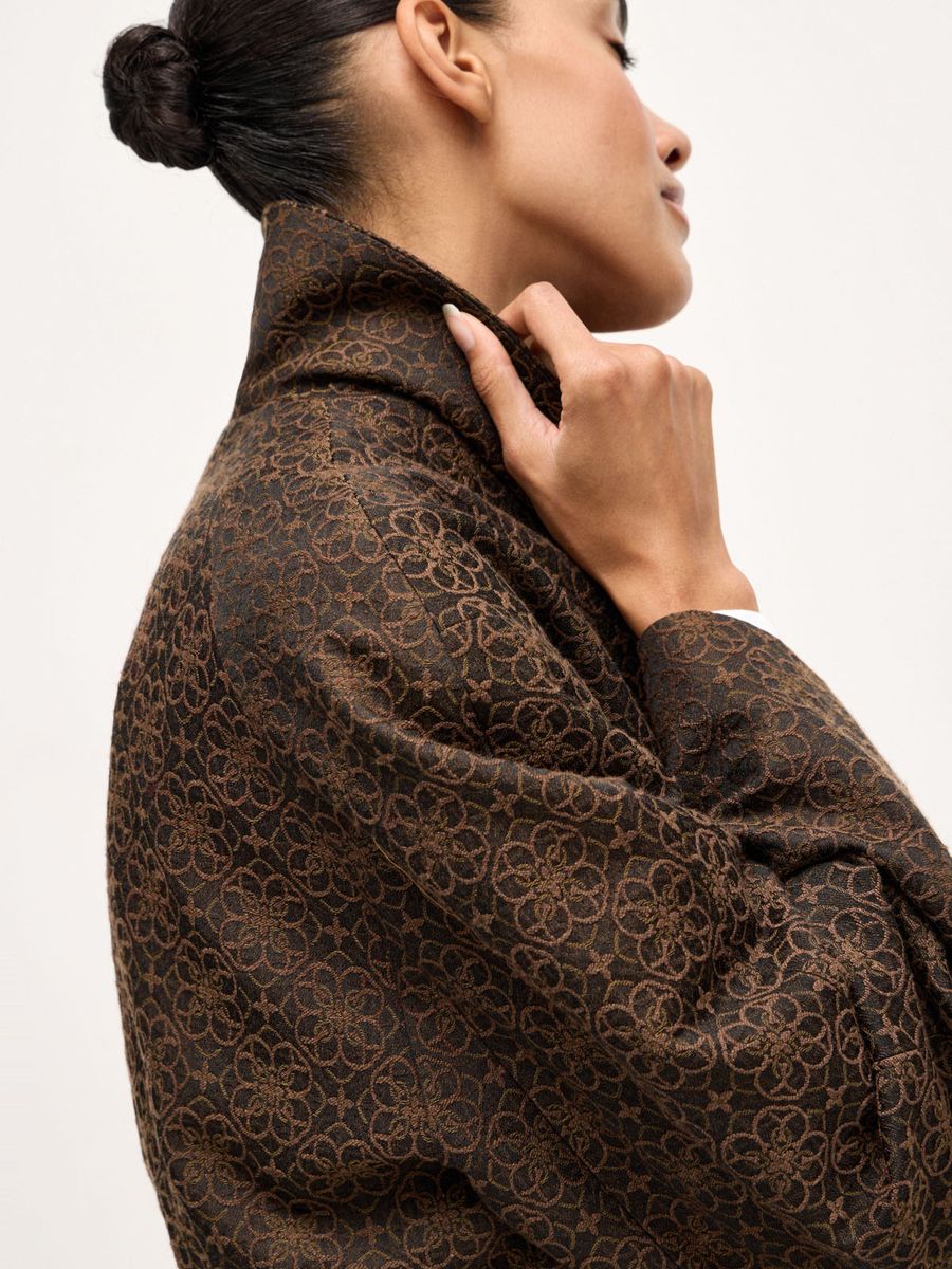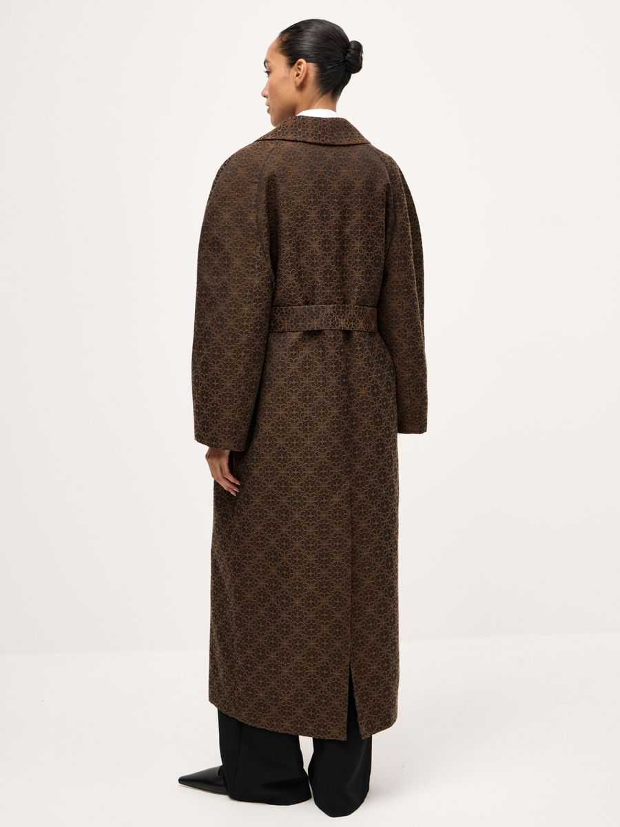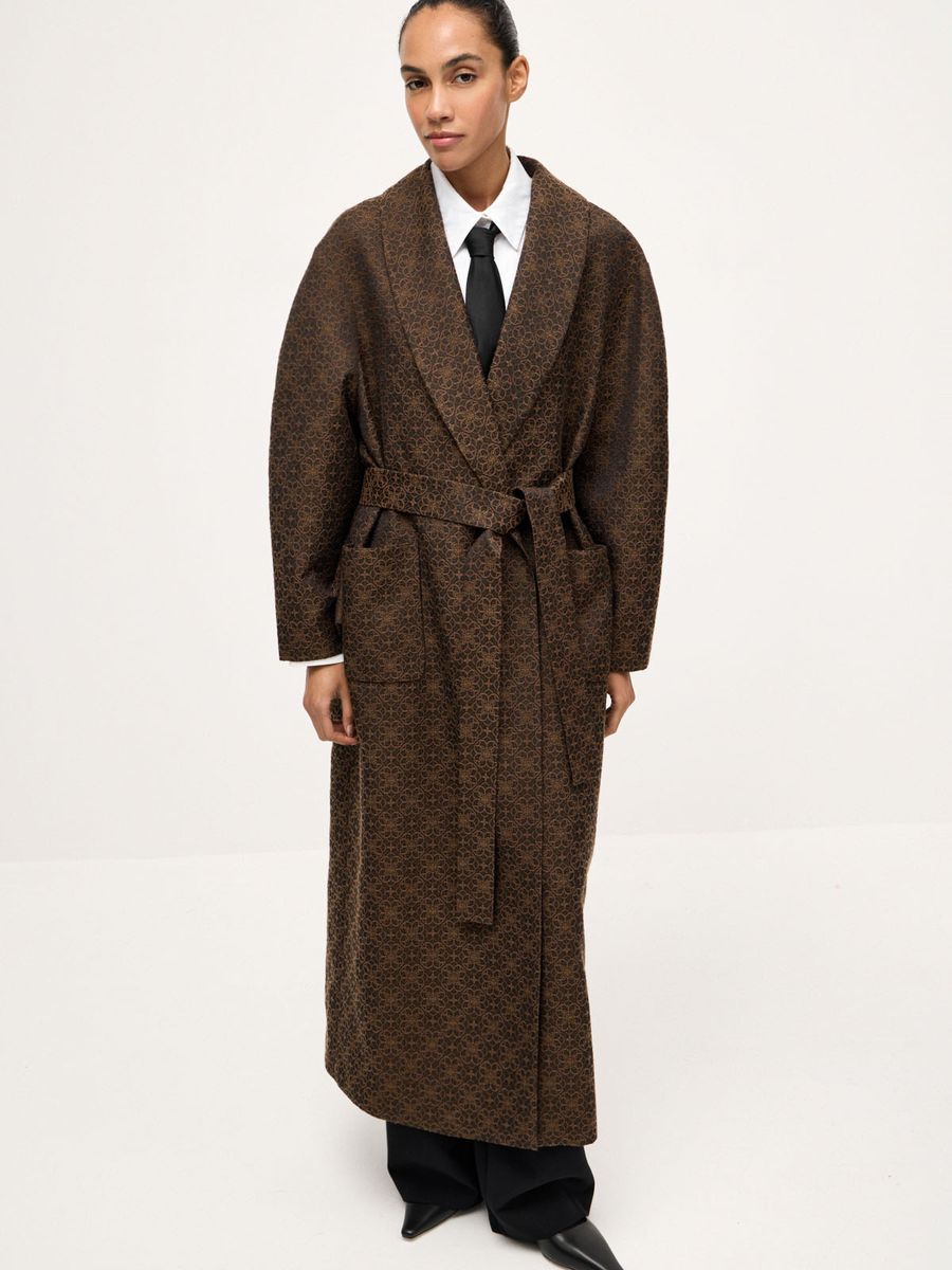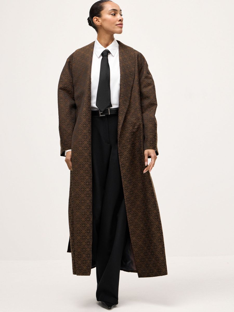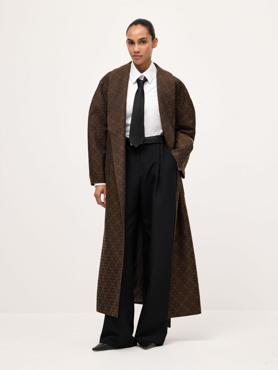 Этот тренч-халат словно создан для сценария, в котором вы — главная героиня. Плотная струящаяся ткань с деликатным орнаментом отсылает к гардеробу женщин, которые легко управляют своим ритмом жизни — будь то рабочий завтрак, поздняя встреча в офисе или путь из галереи в любимый ресторан.