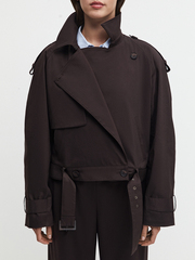 Мини-тренчкот из хлопка — классика с налетом дерзости. В его исполнении угадываются визуальные отсылки к культовым моделям и бунтарским косухам 80-х: объемные лацканы, графичность силуэта, четкие линии и смелые акценты. Укороченный крой добавляет динамики, а ремень на талии и широкие манжеты позволяют регулировать посадку.