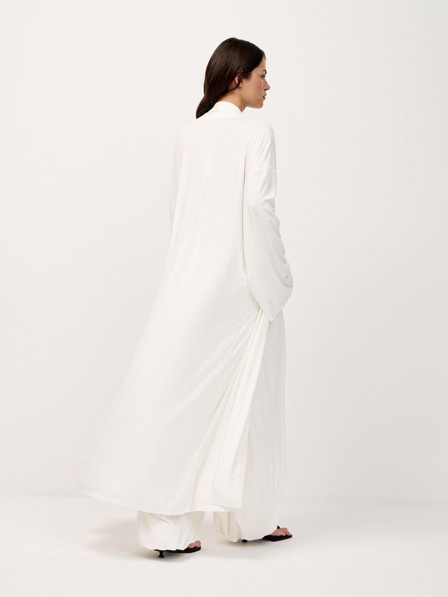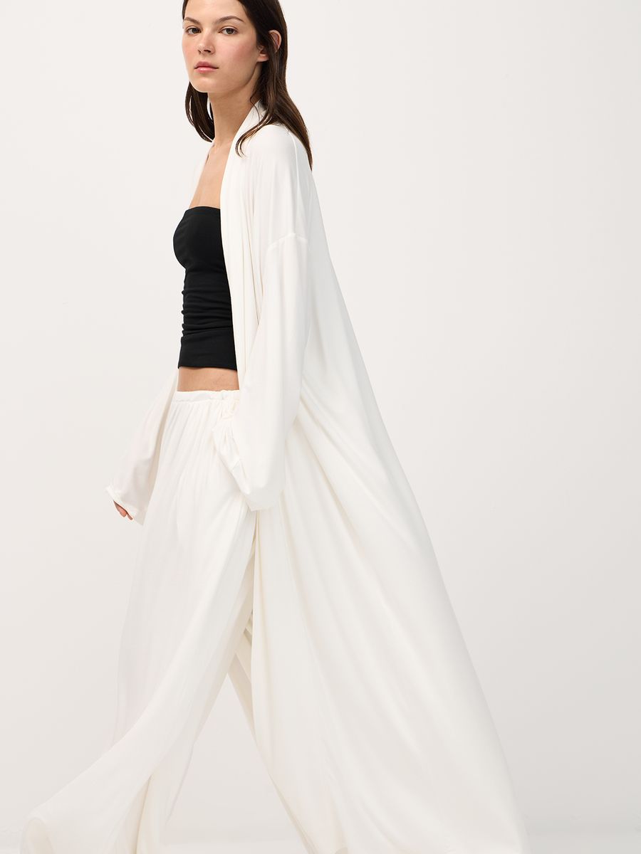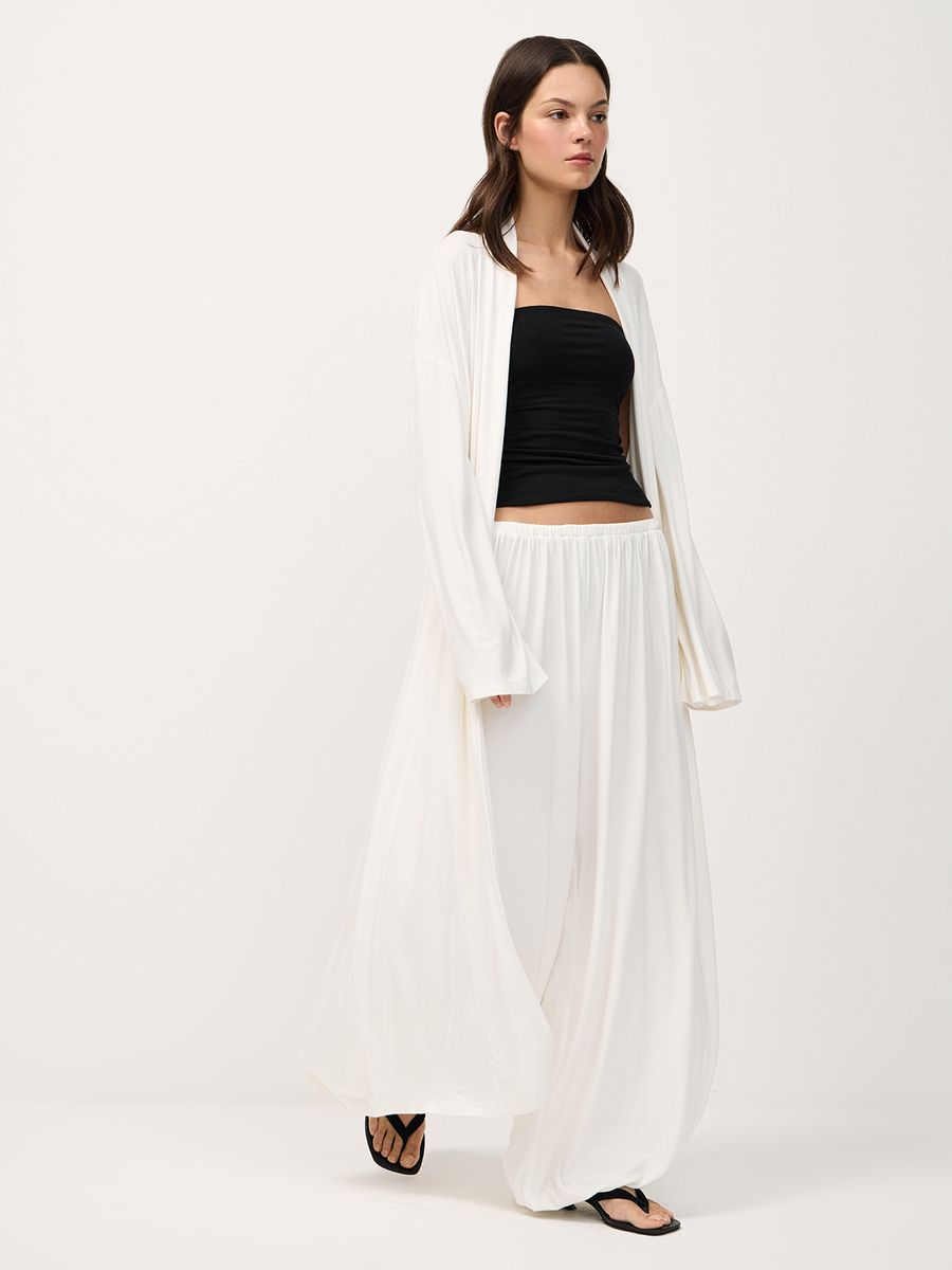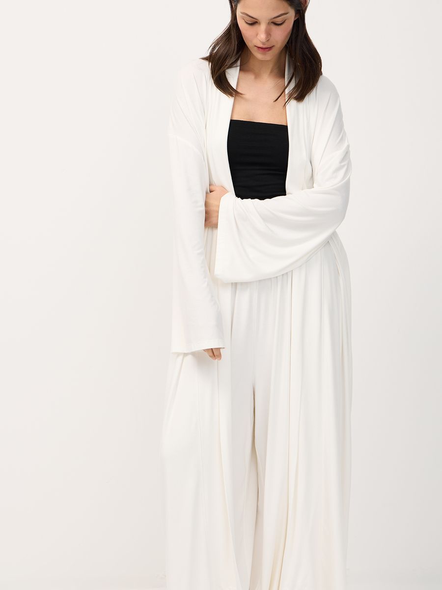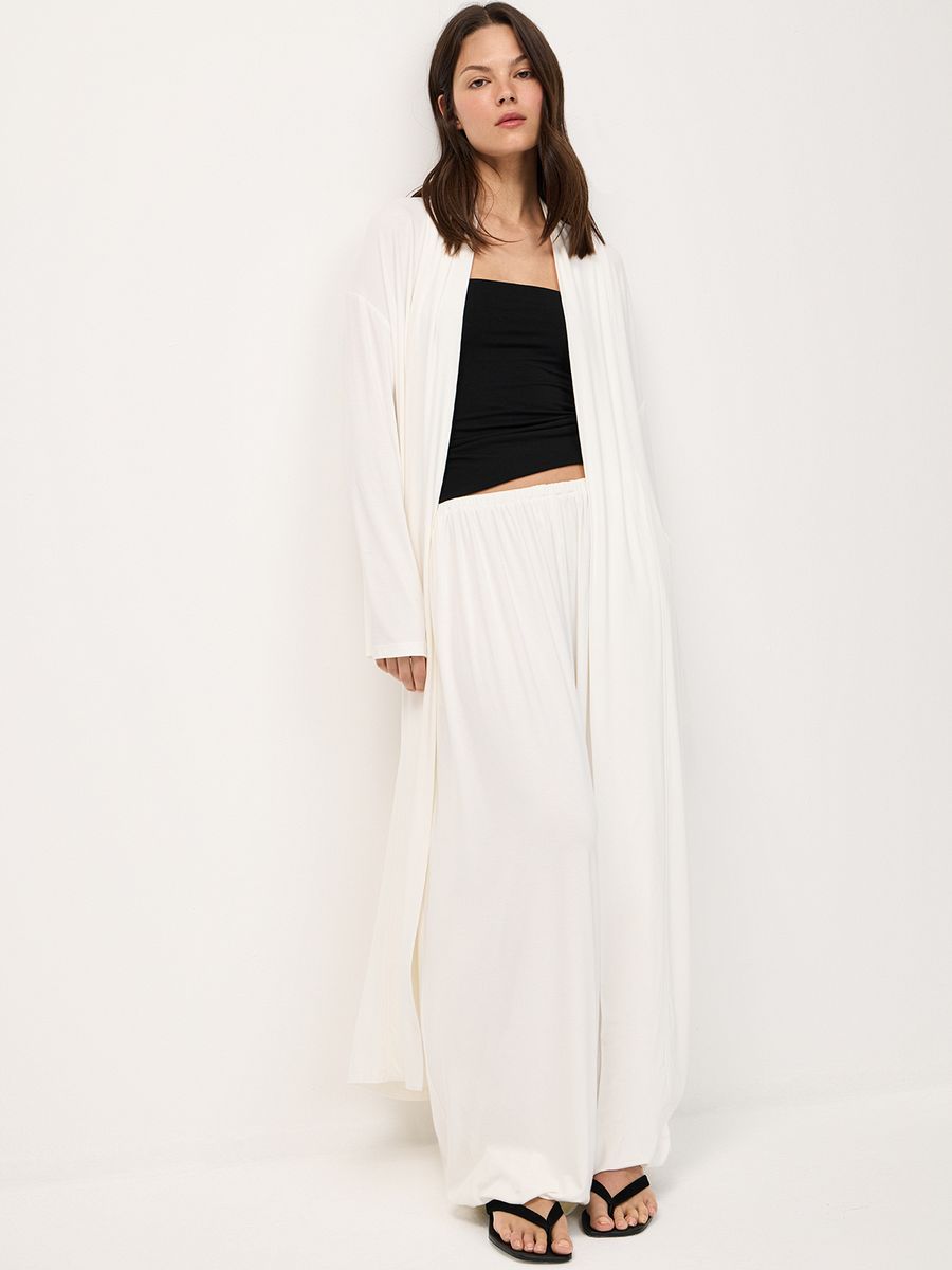 Свободный силуэт, спущенная линия плеч и мягкий, струящийся трикотаж — все в этой модели намекает на неспешное утро и минимум дел в календаре. Кардиган легко надевается поверх топа или купальника, добавляя образу расслабленности и объема. Идеальный формат для переключения в личный режим. Но мы предпочитаем сочетать с брюками day-off — для максимального визуального комфорта и непринужденной цельности.