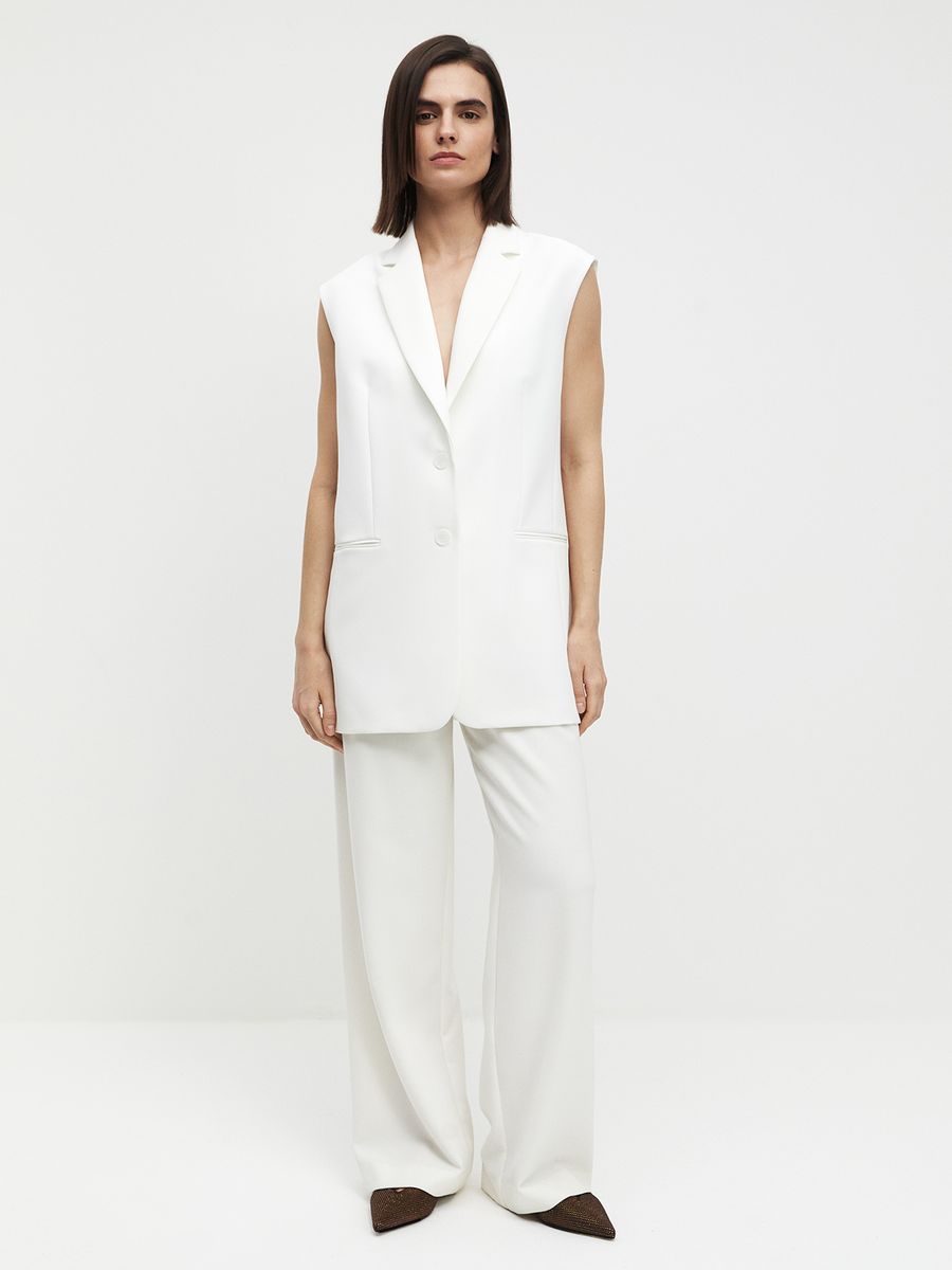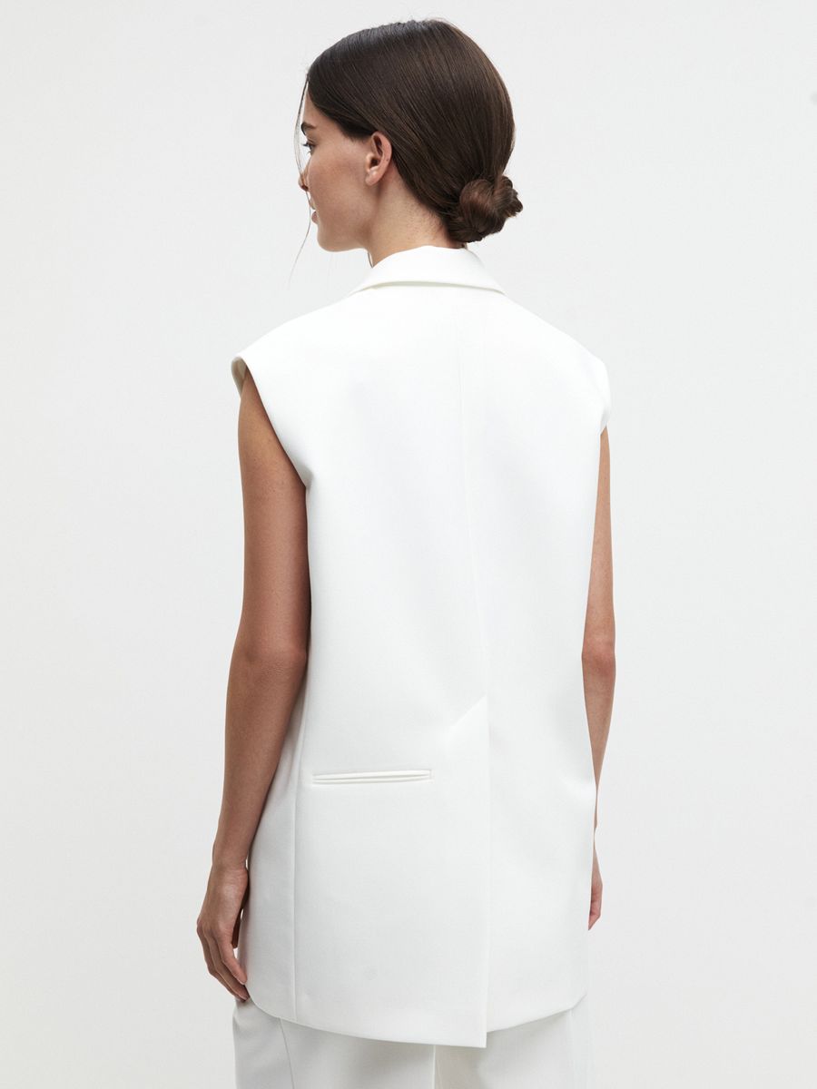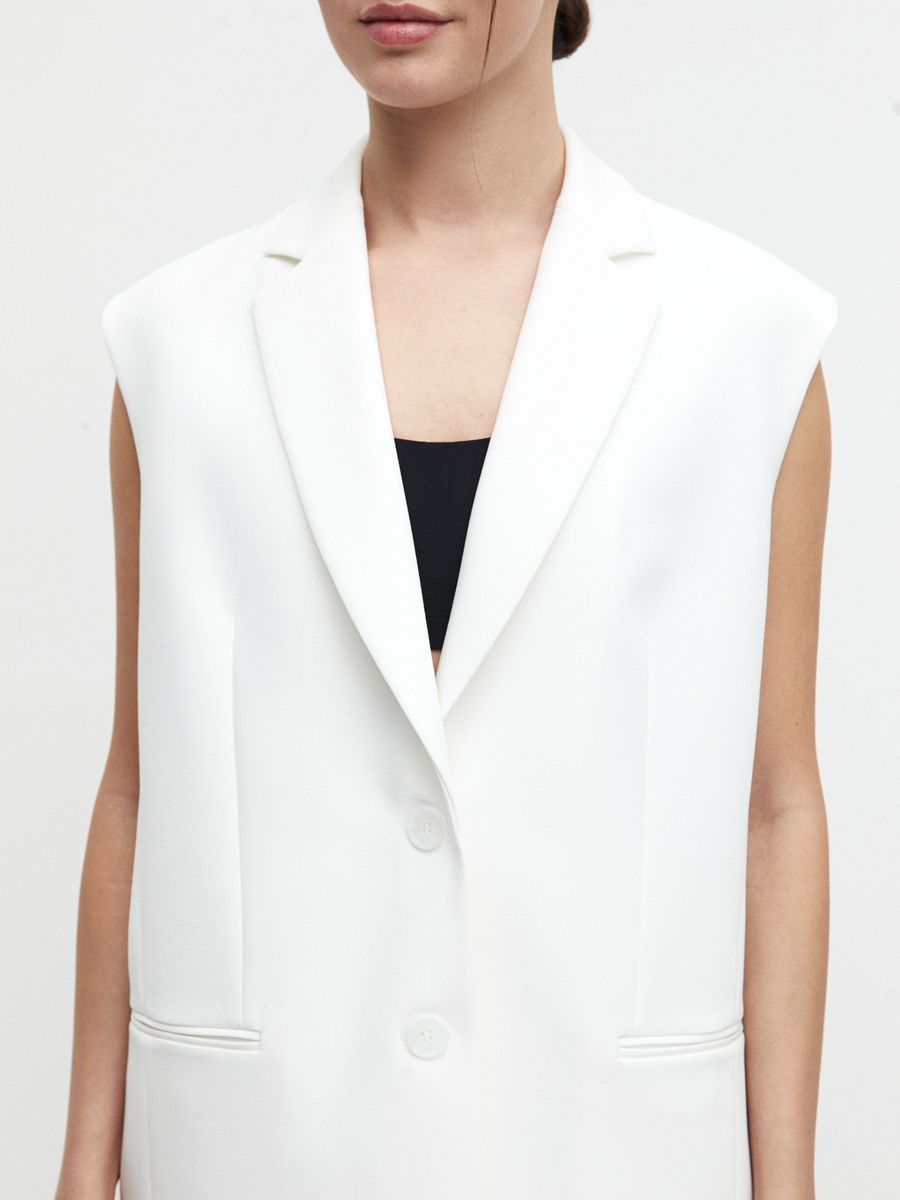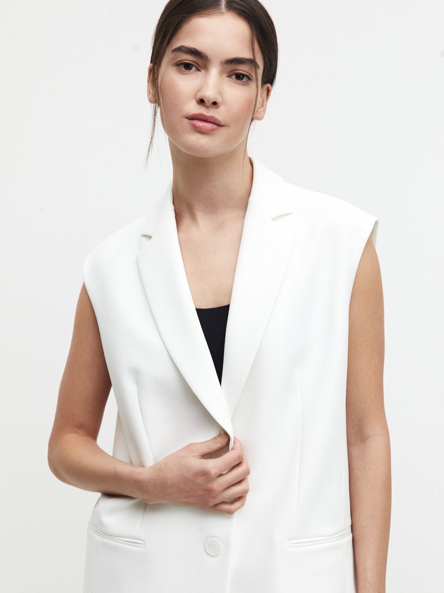 Удлиненный жилет work-life blend — о том, как легко переключаться с рабочих будней на теплые вечеринки под открытым небом, даже если этого не было в ваших планах. Прямой силуэт и лаконичное исполнение придают строгости, а мягкий молочный оттенок освежает образ и позволяет стилизовать жилет в зависимости от случая. Настоящее statement-изделие, которое подчеркивает уверенность и хрупкость своей обладательницы.