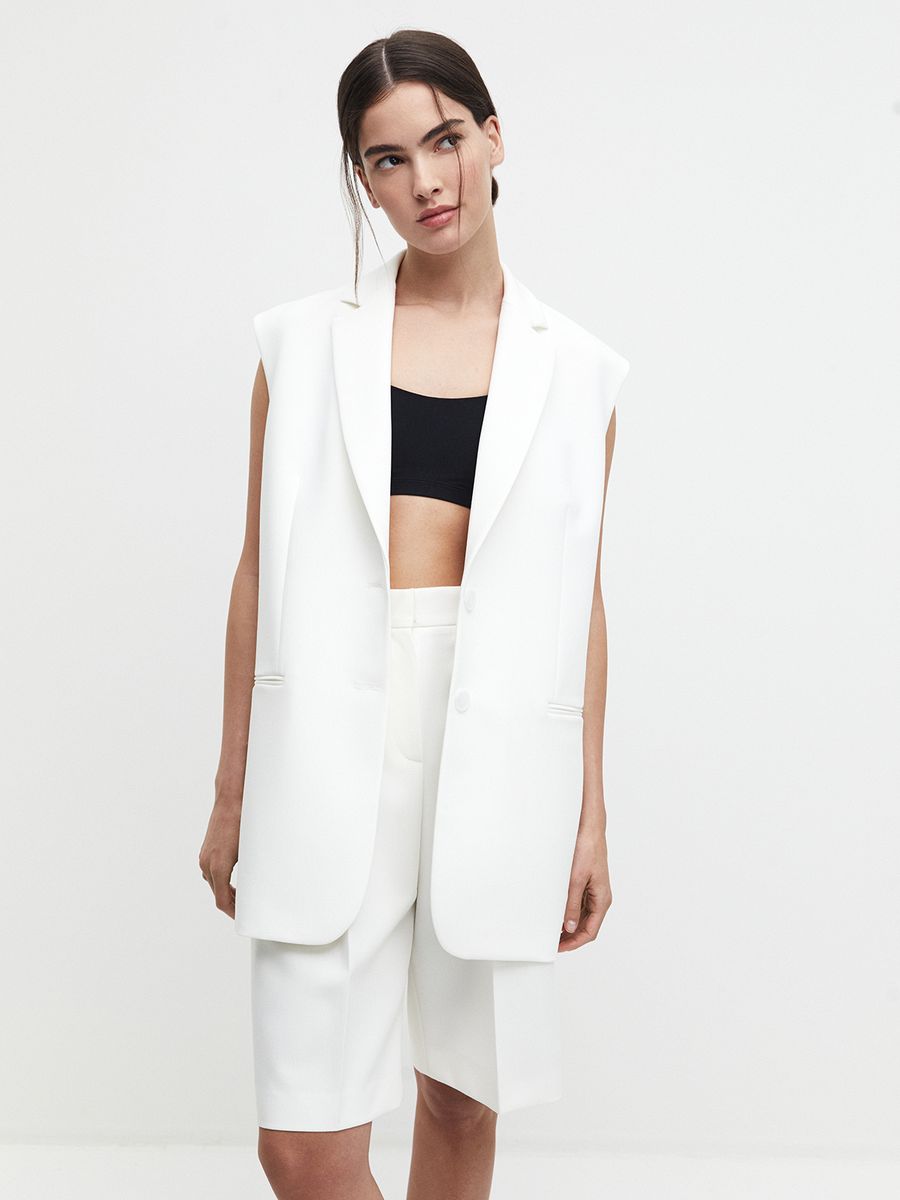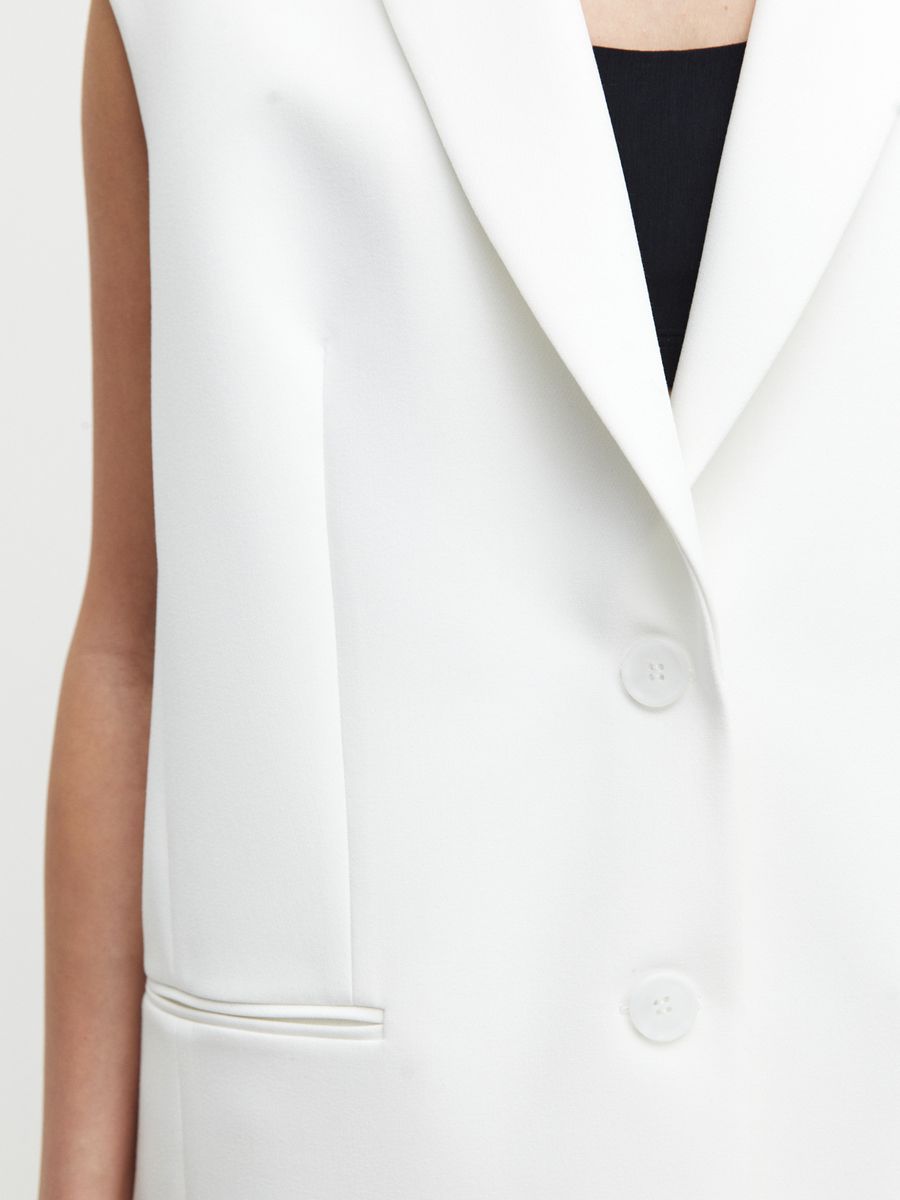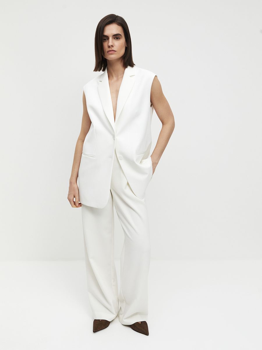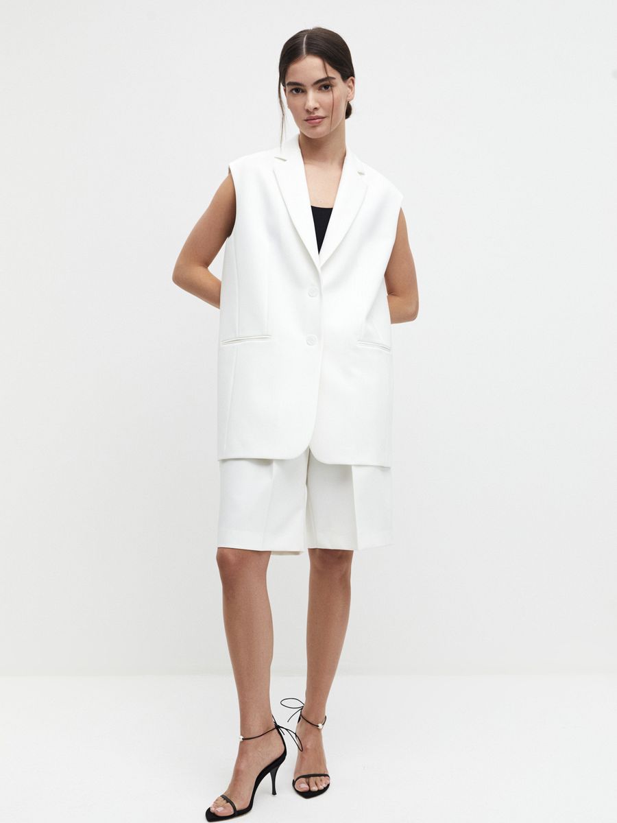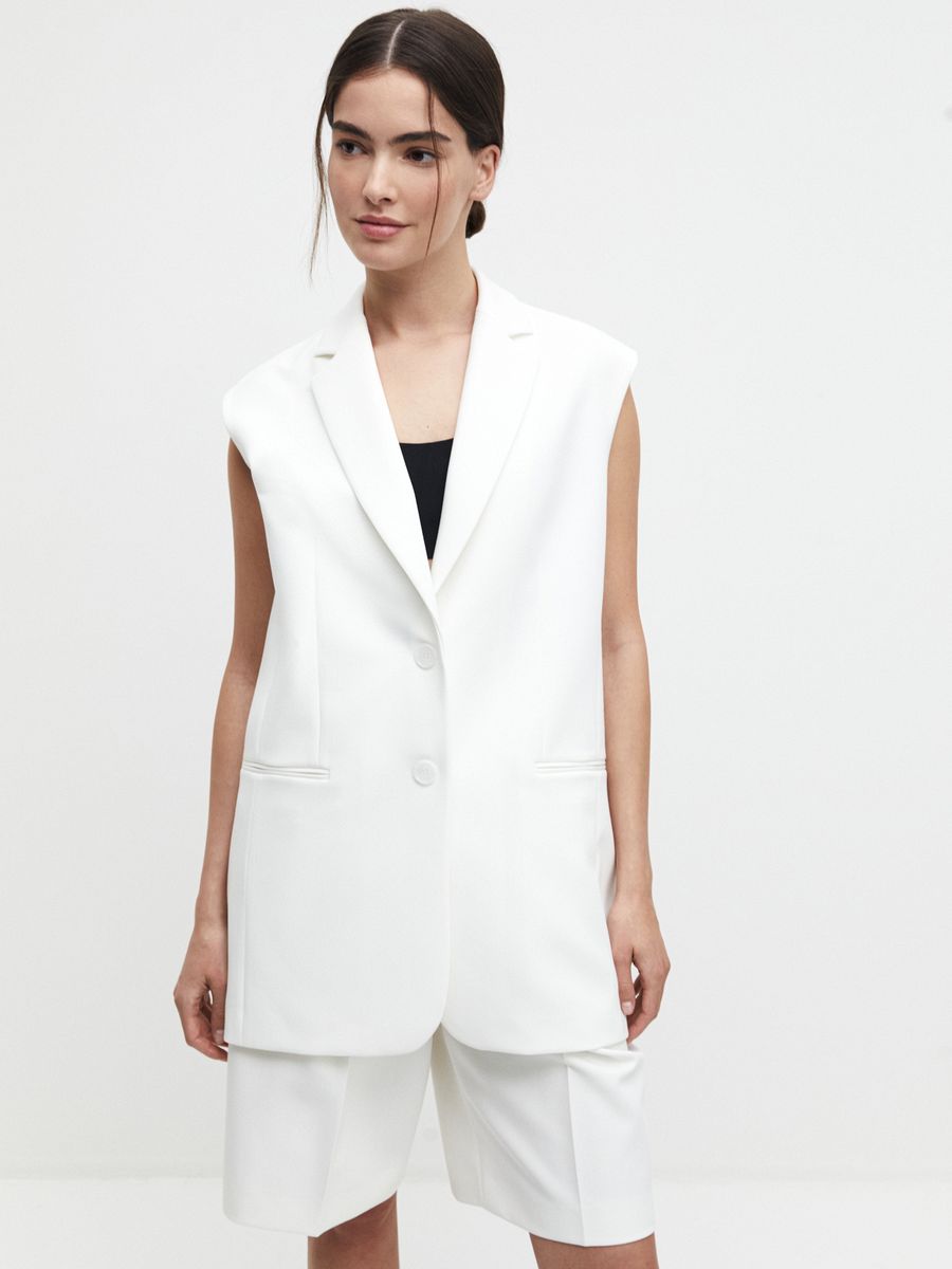 Удлиненный жилет work-life blend — о том, как легко переключаться с рабочих будней на теплые вечеринки под открытым небом, даже если этого не было в ваших планах. Прямой силуэт и лаконичное исполнение придают строгости, а мягкий молочный оттенок освежает образ и позволяет стилизовать жилет в зависимости от случая. Настоящее statement-изделие, которое подчеркивает уверенность и хрупкость своей обладательницы.