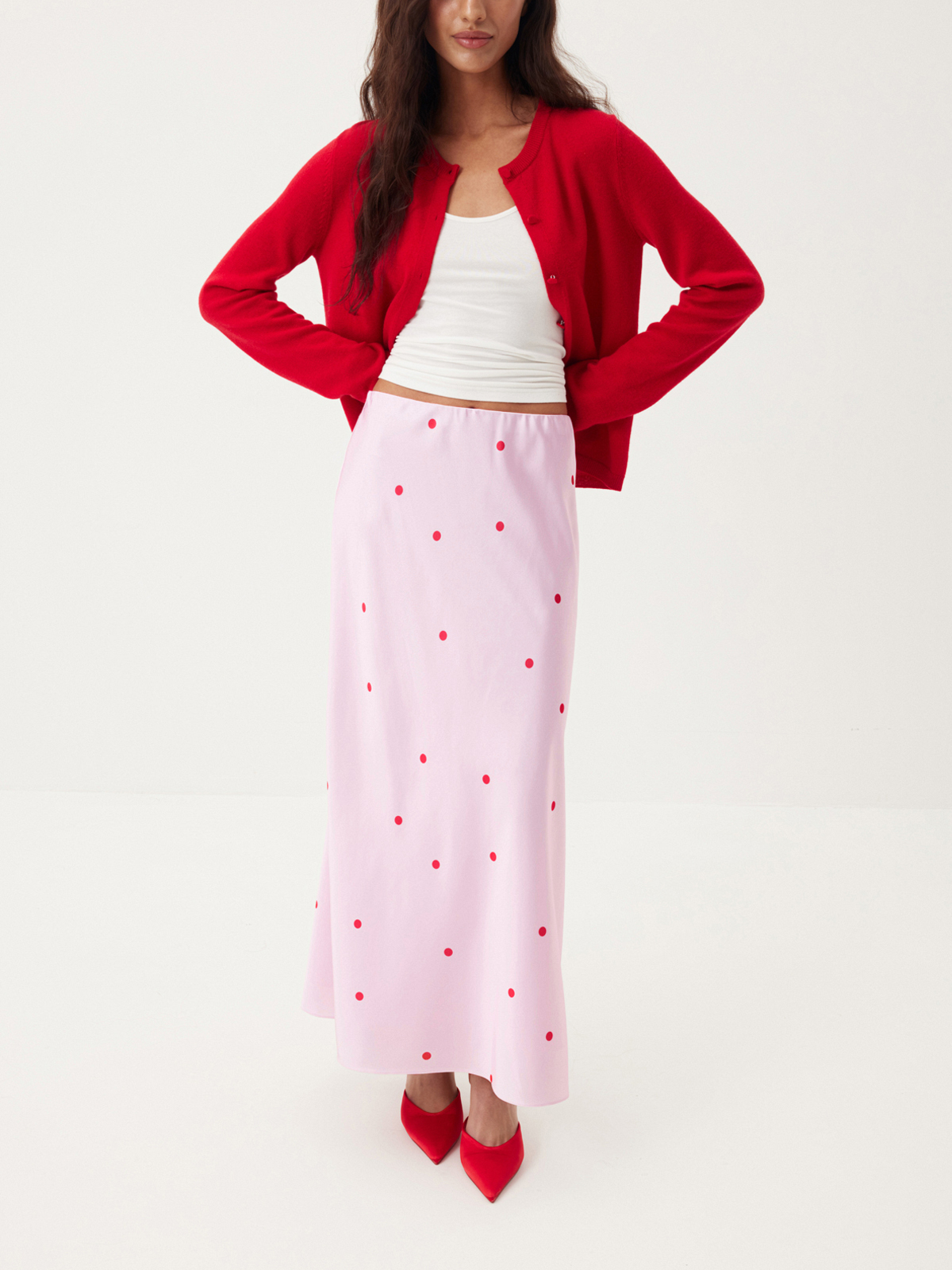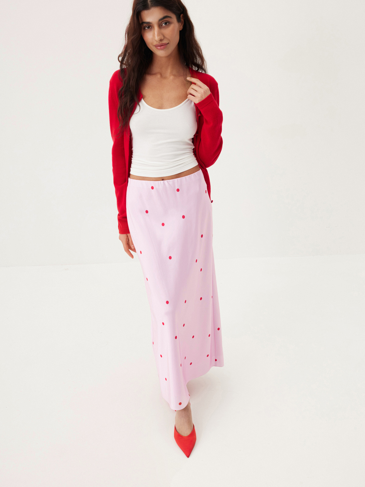В струящейся юбке-миди Sweetly Dots хочется наслаждаться каждым моментом, словно вы — героиня романтической киноленты. Модель в нежной красно-розовой палитре приобретает кокетливый характер благодаря мелкой россыпи горошка. Стилизуем айтем с облегающим топом на тонких бретелях и кардиганом Red Rose — тот самый образ, влюбляющий в себя с первого взгляда.
