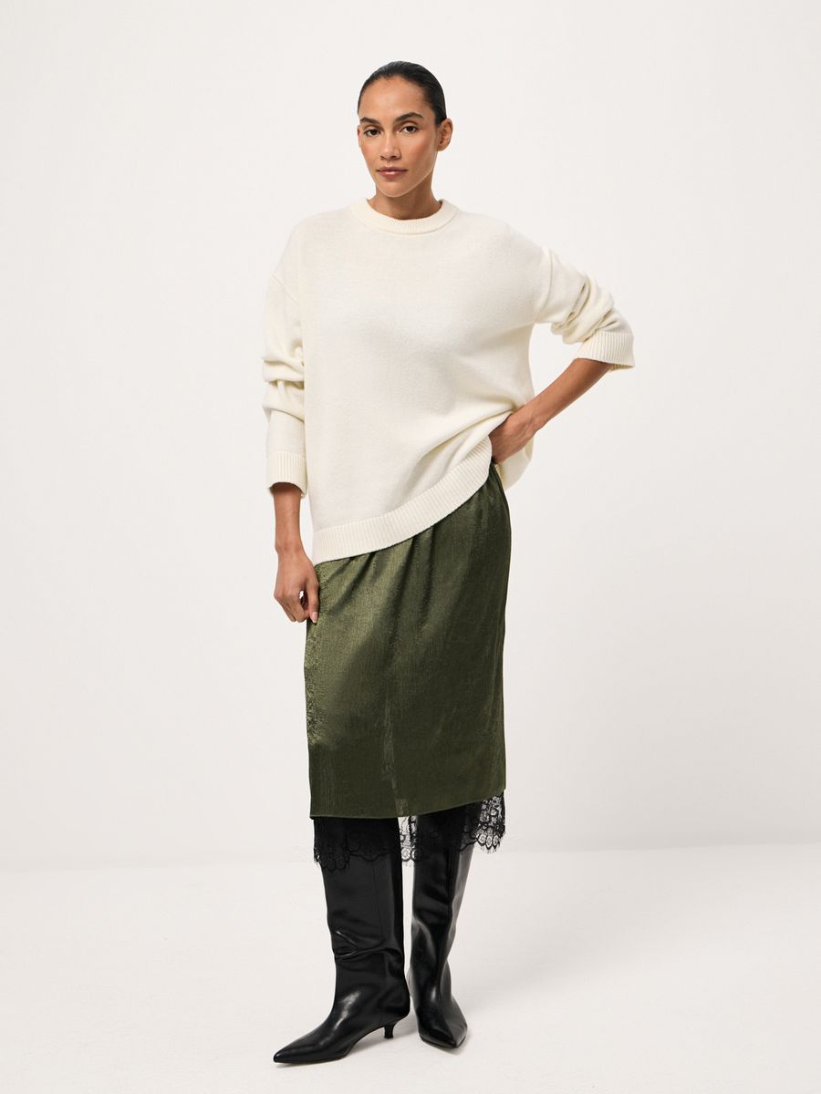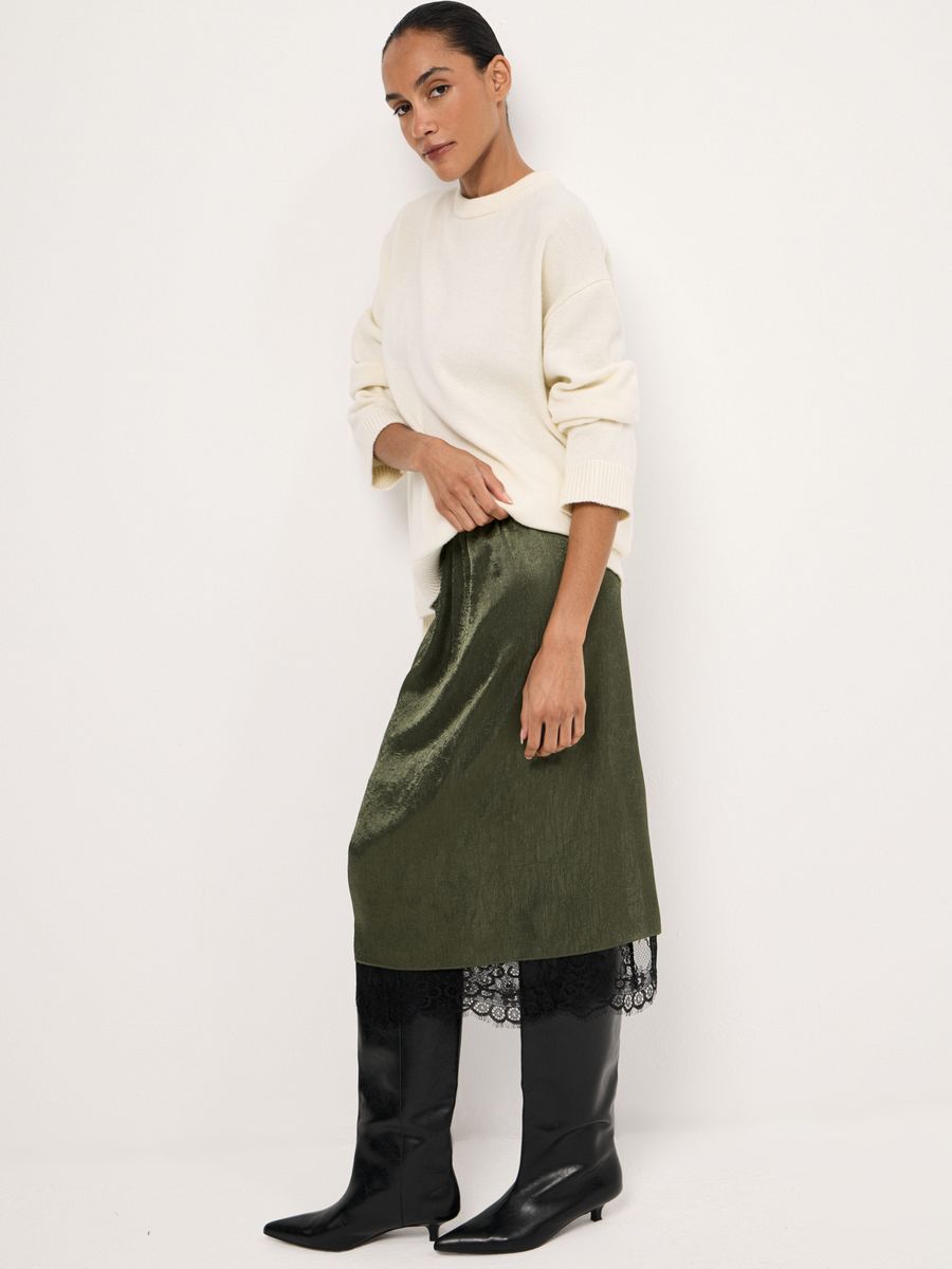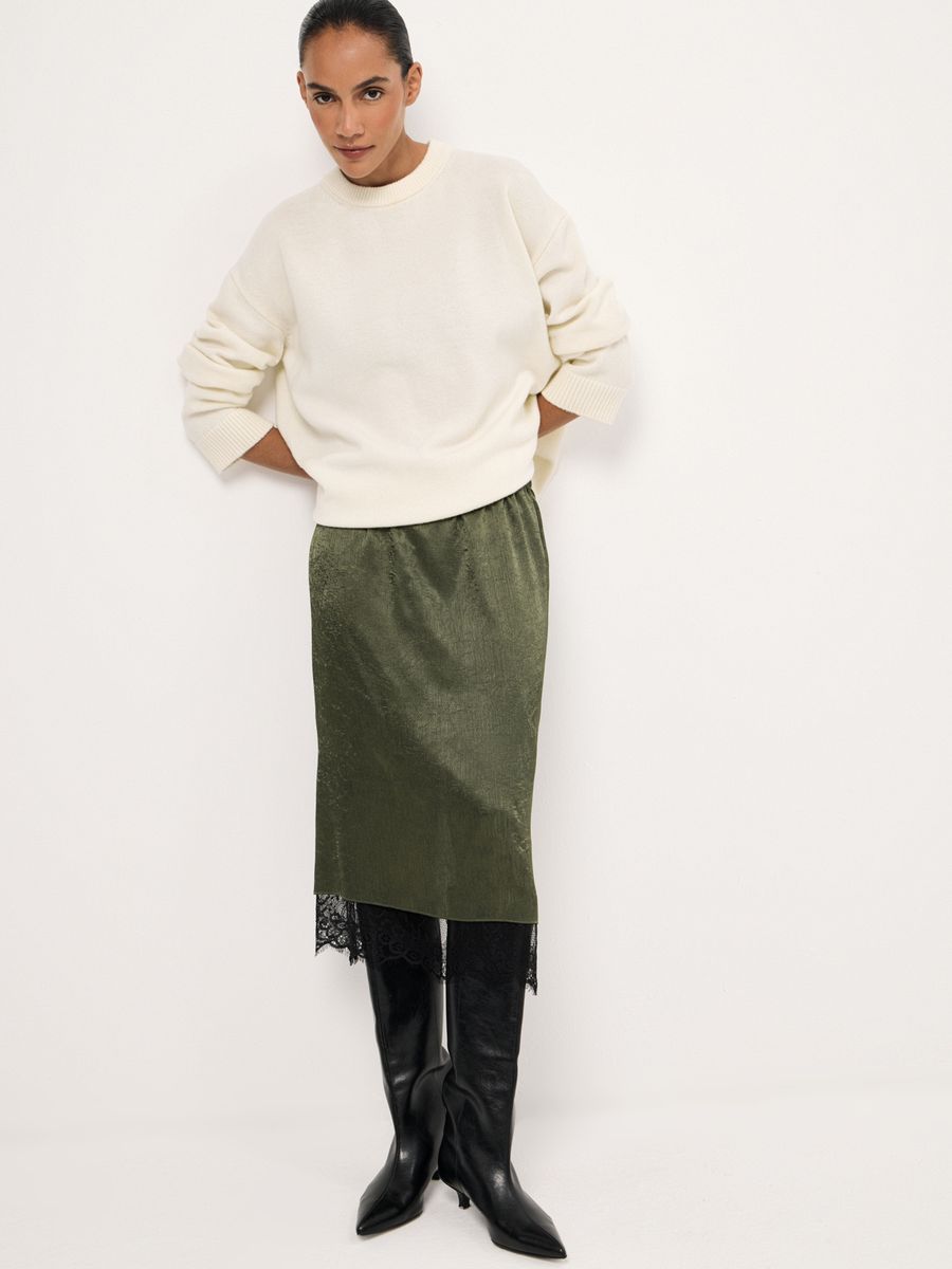 Совершенный минимализм и изящество в каждой детали — юбка в бельевом стиле Lovely Lace. Ткань с роскошной фактурой, утонченный силуэт и деликатное кружево делают модель идеальным выбором для женственных стилизаций. Изделие прямого кроя с аккуратной резинкой на талии станет незаменимой основой для торжественных аутфитов и добавит изысканности повседневным образам. Сочетаем утонченный айтем с уютным джемпером Merino Essential и дополняем модный контраст фактур высокими сапогами из кожи.