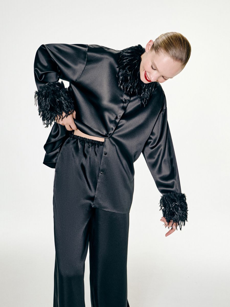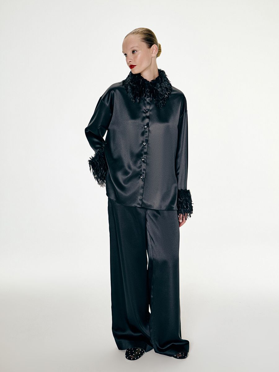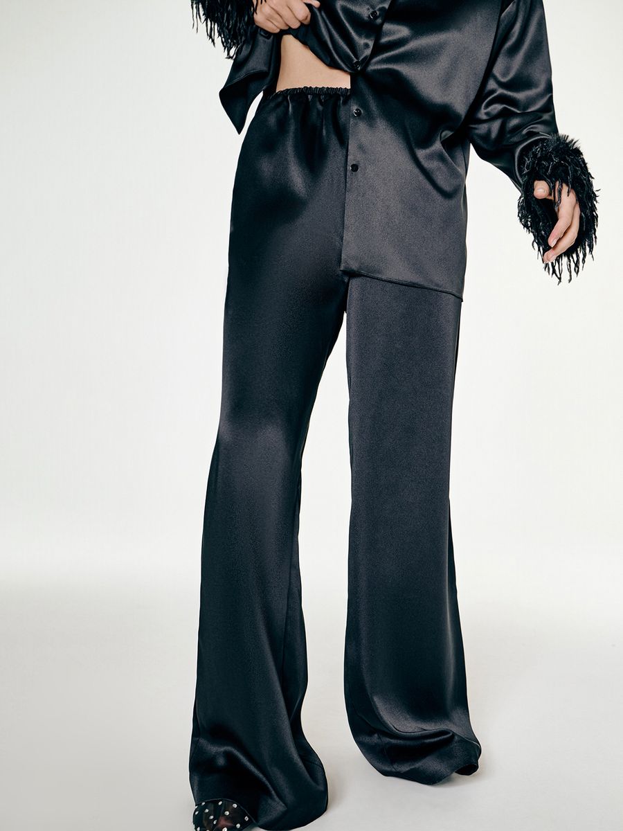 Брюки The Panther Of Business — это про легкость и дерзость одновременно. Расслабленный крой и струящийся сатин с деликатным блеском превращают их в идеальный элемент для смелого и эффектного образа. Эти брюки идеально дополняют блузу из того же материала, образуя сет, который создан для героини, готовой отложить все рабочие задачи и с головой окунуться в планирование нового сезона праздников и вечеринок.