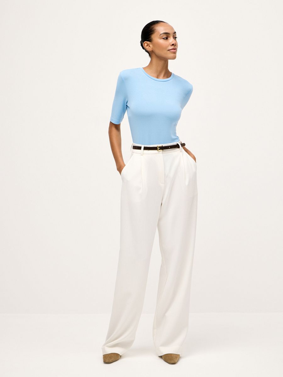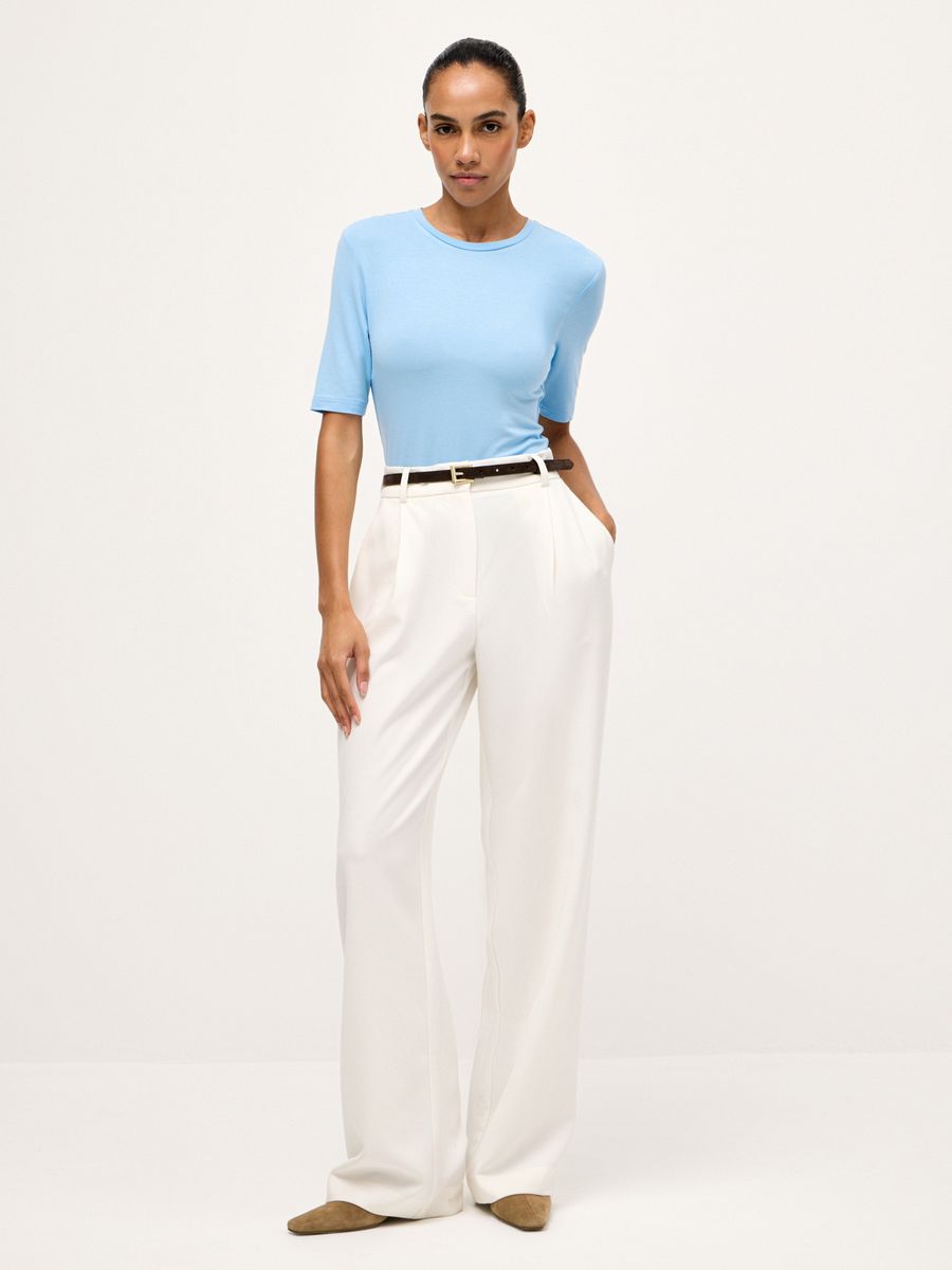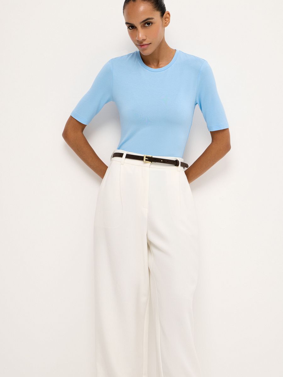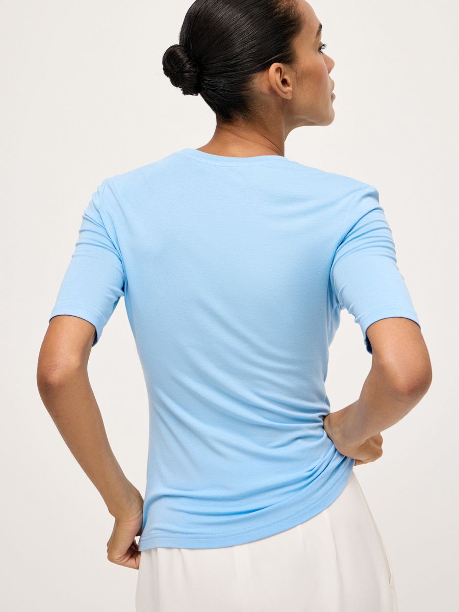 Облегающая футболка Base в оттенке чистого дневного неба — тот самый незаменимый элемент гардероба, к которому хочется возвращаться снова и снова. Мягкая, эластичная ткань комфортно облегает тело, аккуратно подчеркивая силуэт, а удлиненный рукав добавляет утонченности. Ее легко представить в паре с джинсами и лоферами на воскресном бранче, с юбкой миди и крупными украшениями на встрече с подругами или соло в загруженные будни. Нет сомнений, что она станет той самой основой в гардеробе на весь период весенне-летнего тепла.