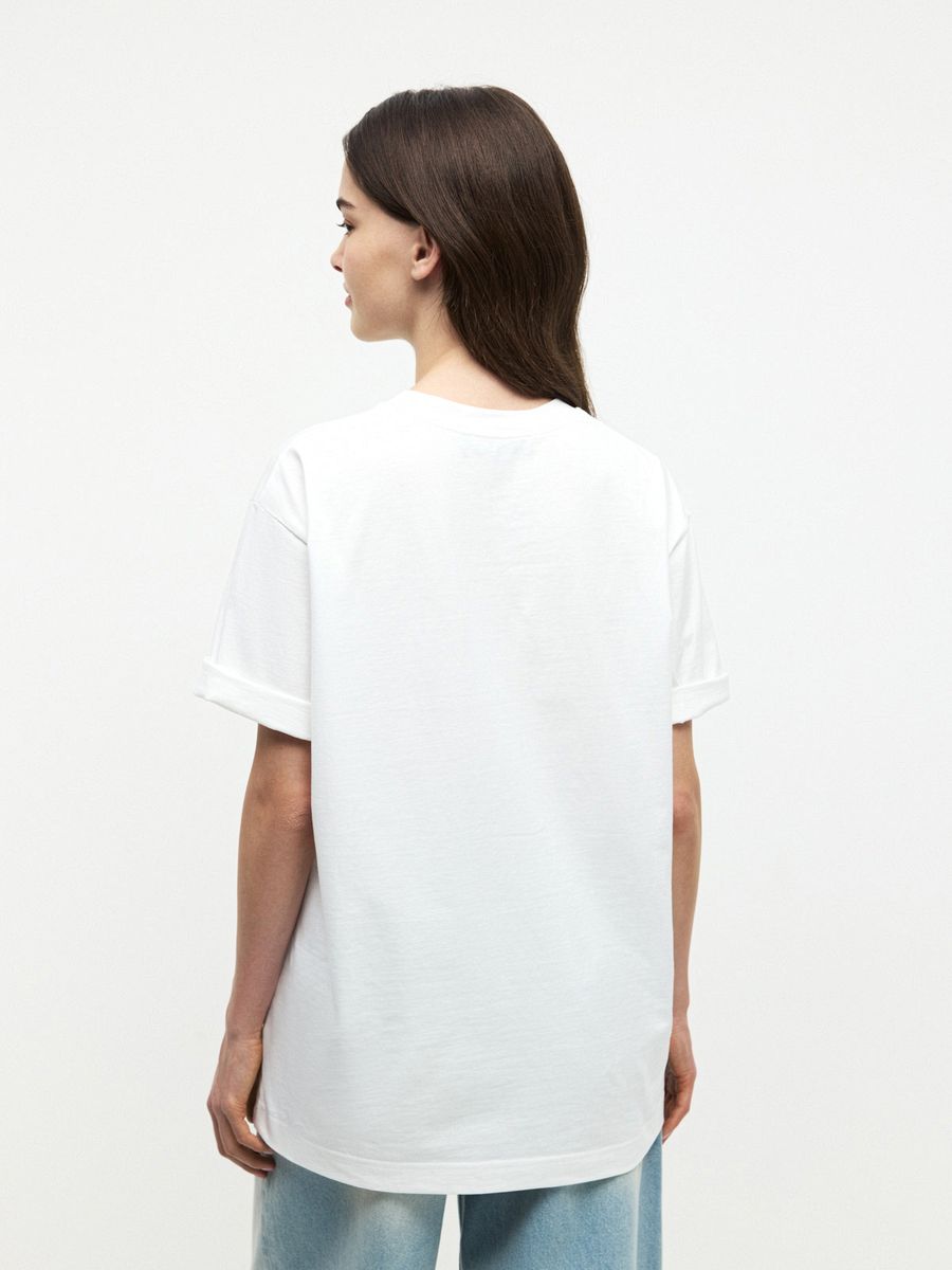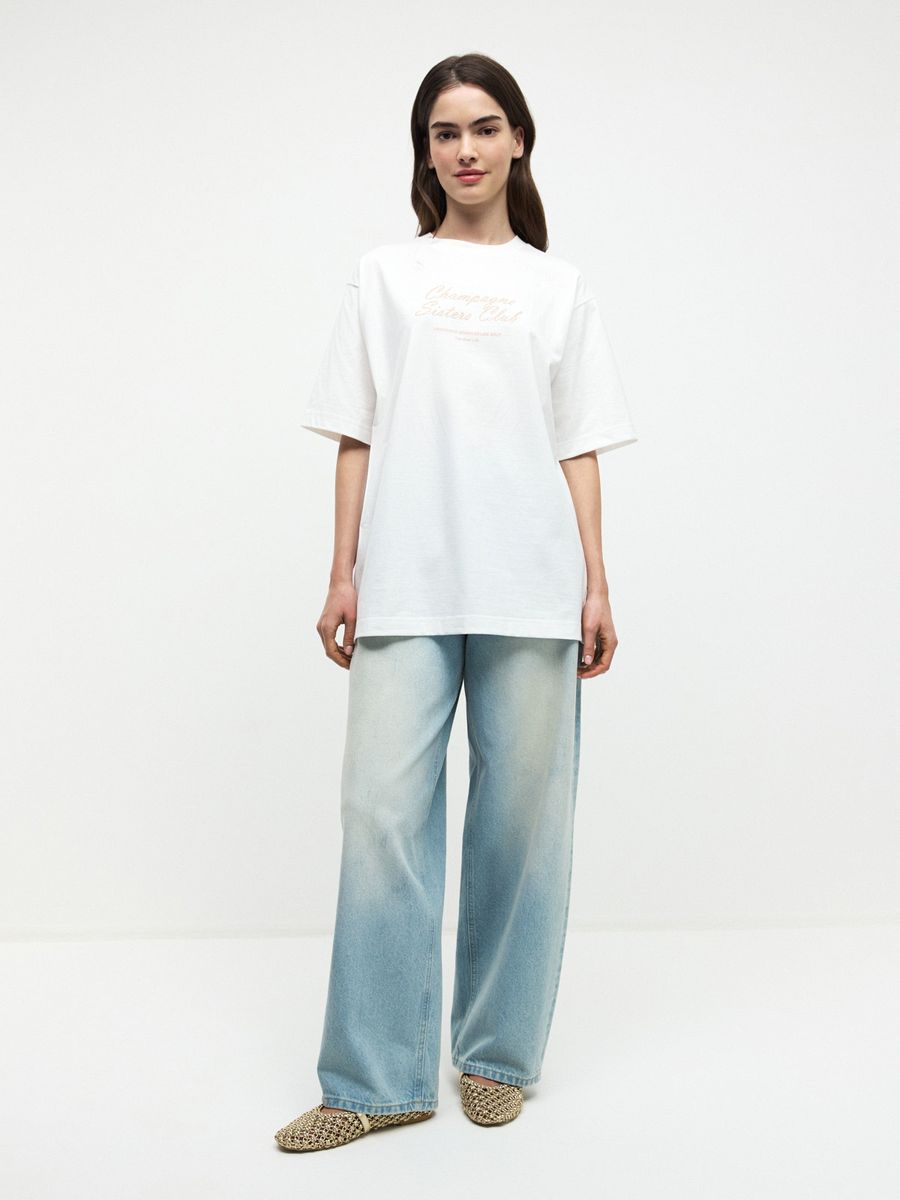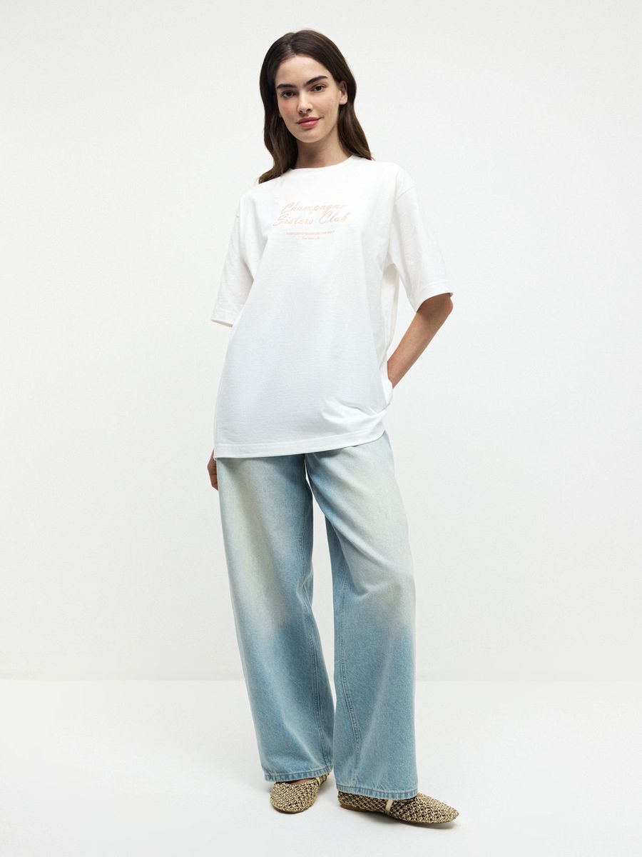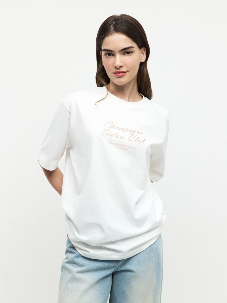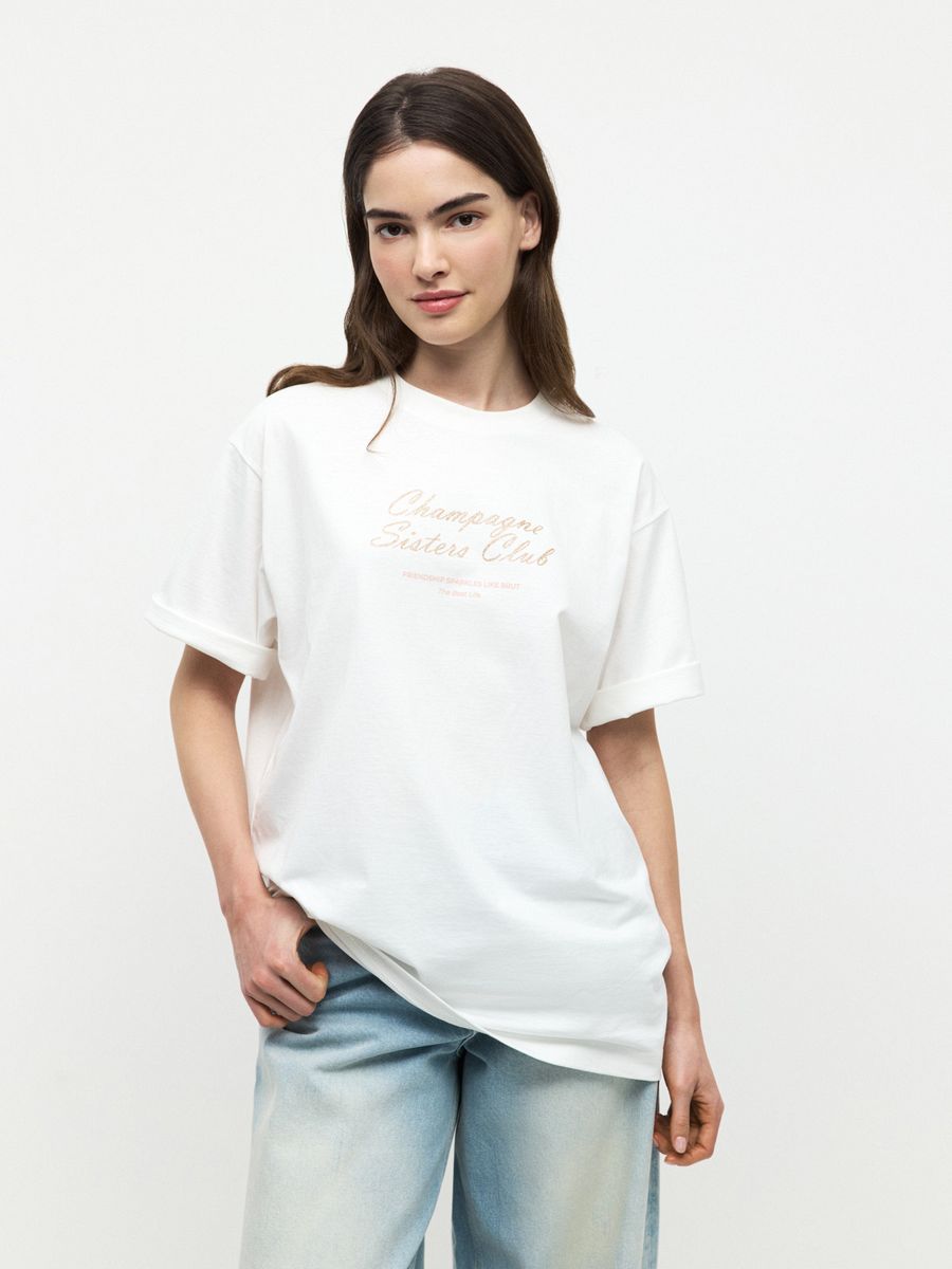 Идеально плотная, в меру объемная и невероятно универсальная футболка со сверкающим принтом «Champagne Sisters Club» — базовый элемент любых образов: от формального до торжественного. Используем ее в качестве нижнего слоя в oversize и многослойных образах. Забираем сразу несколько футболок, чтобы создать свое собственное комьюнити из близких подруг или отправиться на девичник к одной из них.