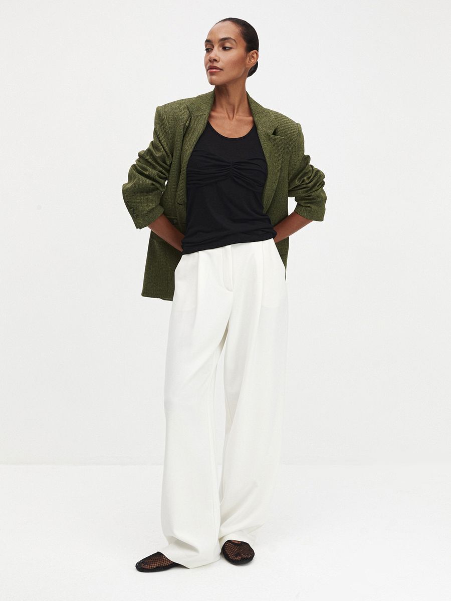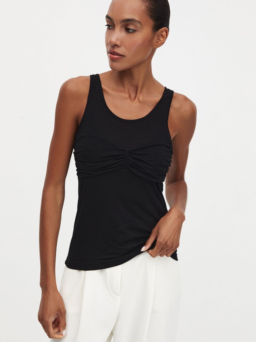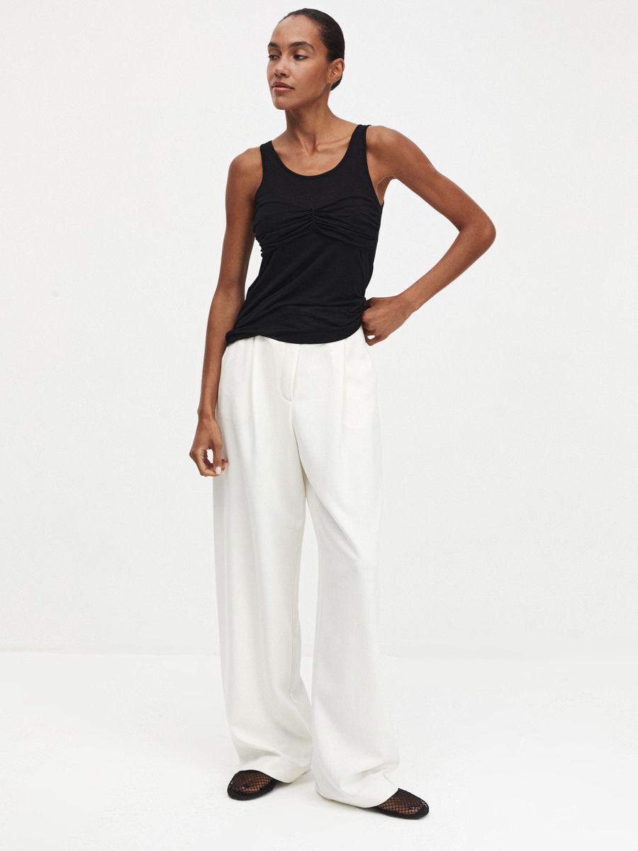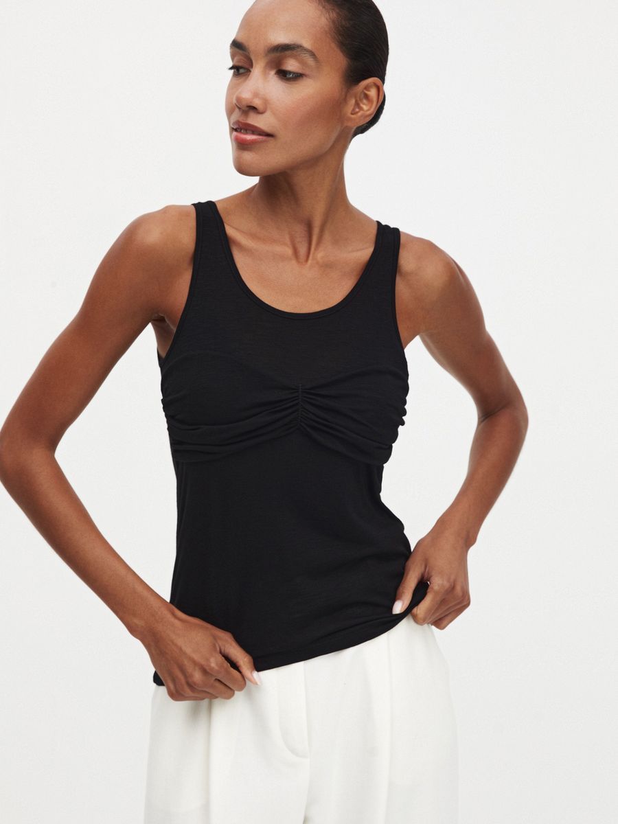 Топ с акцентной драпировкой — идеальное сочетание комфорта и женственности, привлекающее внимание к изящной линии груди. Эта модель станет вашей комфортной базой с ноткой сексуальности для осеннего сезона, в котором многослойность и утонченность играют главную роль.