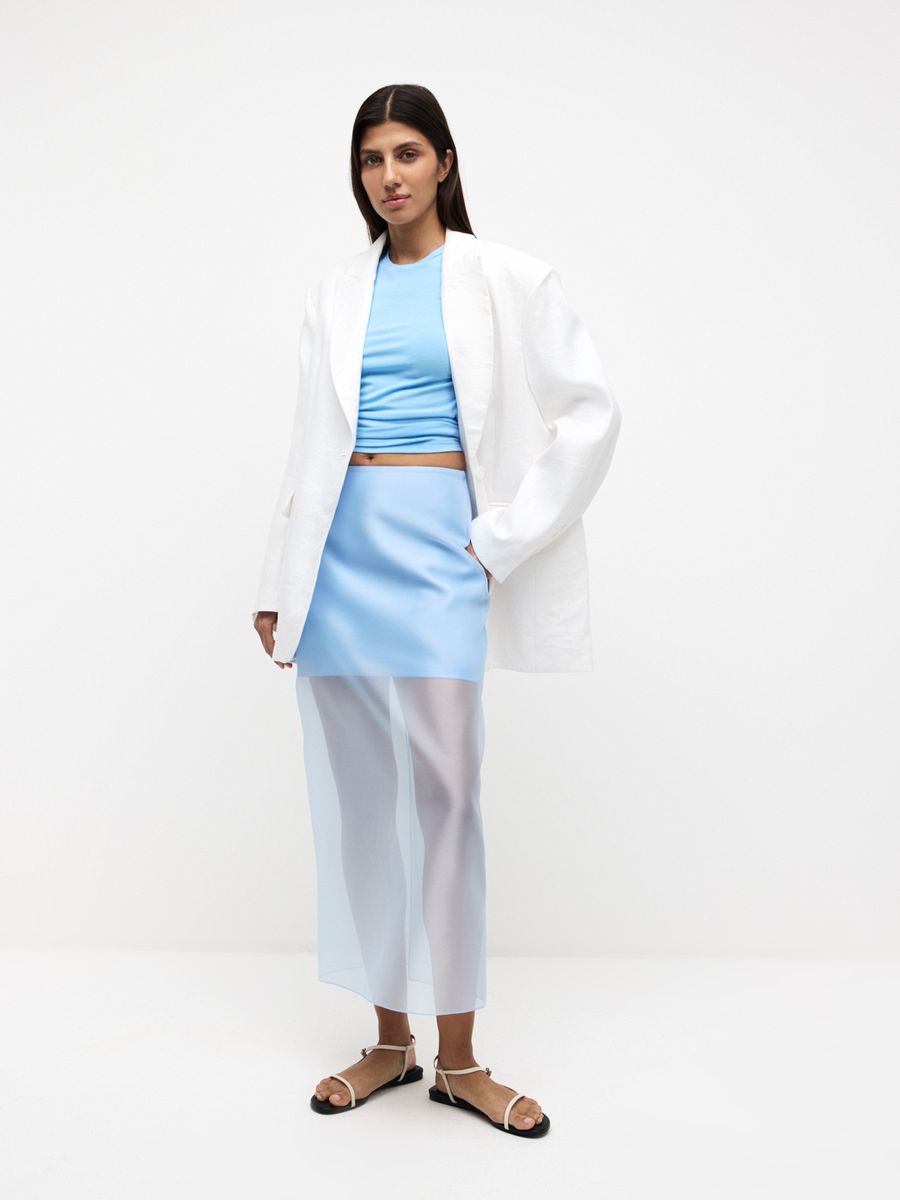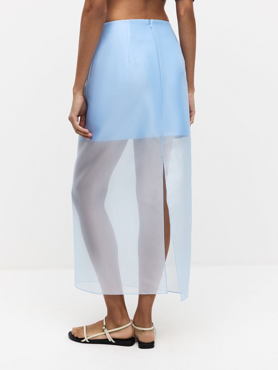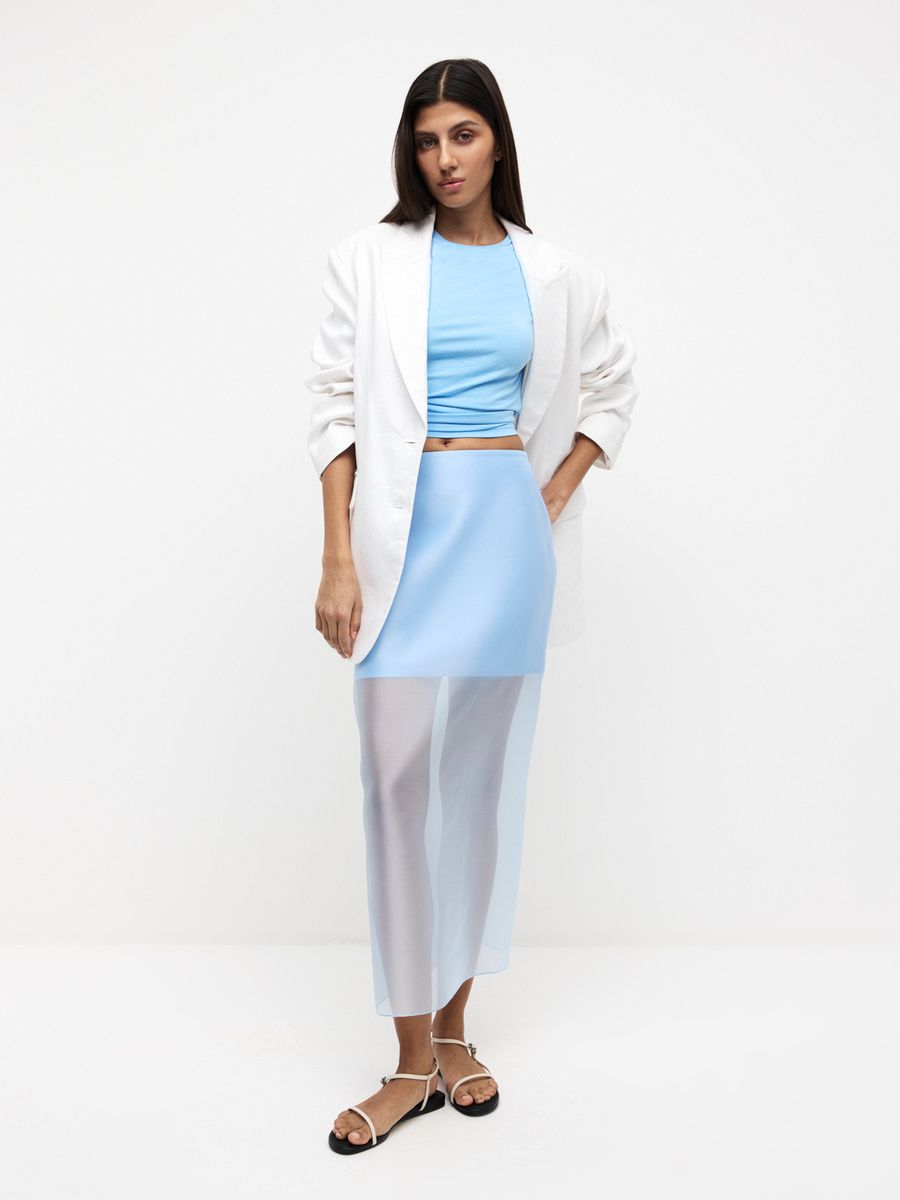 Юбка midaxi Mist In The Air для весеннего сезона, в котором особенно ценишь лаконичность и легкость. Ее длина midaxi идеально балансирует между элегантностью и современной динамикой, подчеркивая изящество силуэта. Полупрозрачный верхний материал напоминает невесомую дымку, играя со светом и создавая впечатление невесомости, а плотная основа подчеркивает структуру формы. Эта юбка окутывает образ легкостью, придавая ему утонченность. Идеальна для сочетания с жилетом с открытой спиной, элегантными жакетами или свободными блузами, добавляя вашему гардеробу нотку романтики и изысканности.