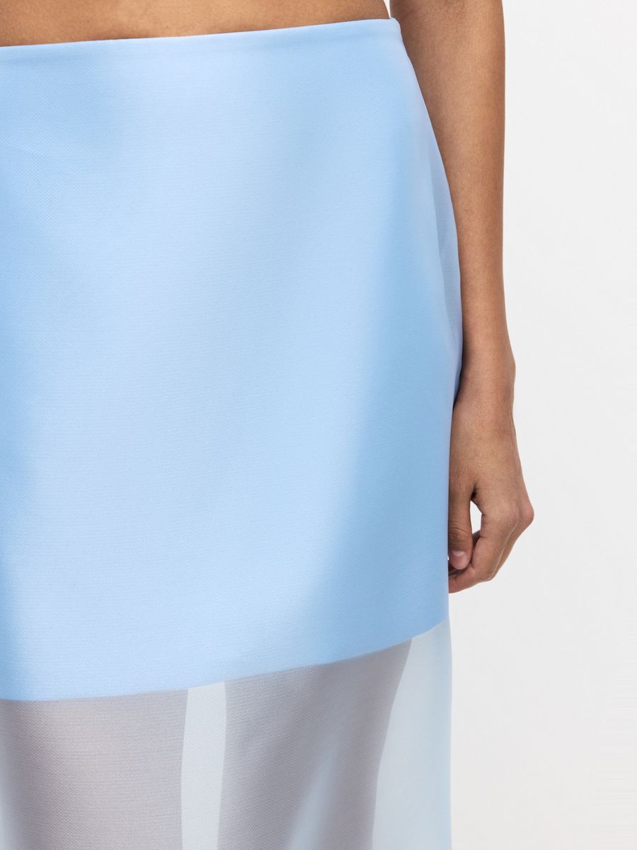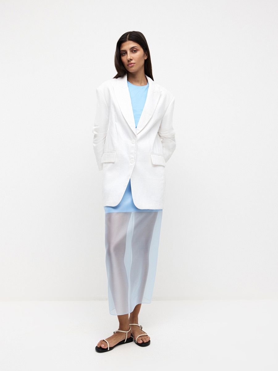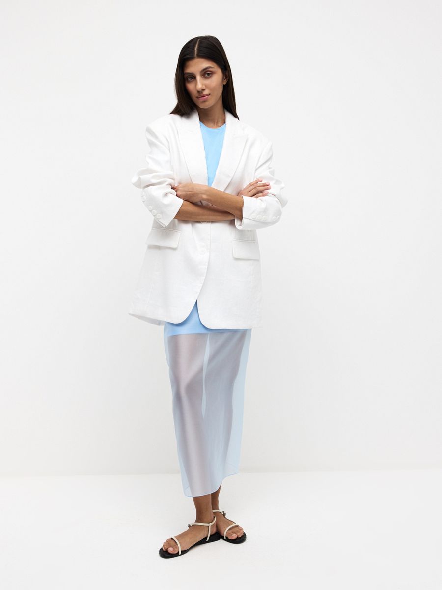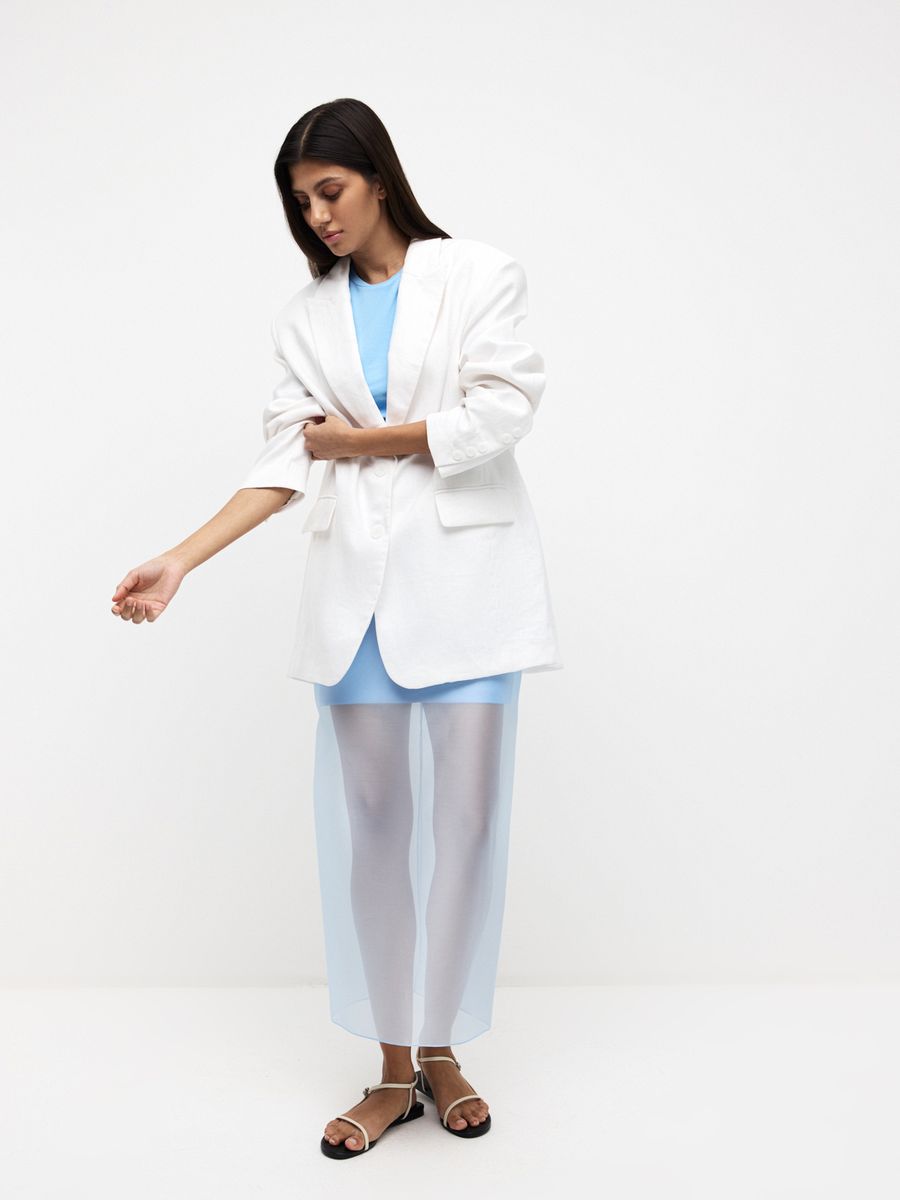 Юбка midaxi Mist In The Air для весеннего сезона, в котором особенно ценишь лаконичность и легкость. Ее длина midaxi идеально балансирует между элегантностью и современной динамикой, подчеркивая изящество силуэта. Полупрозрачный верхний материал напоминает невесомую дымку, играя со светом и создавая впечатление невесомости, а плотная основа подчеркивает структуру формы. Эта юбка окутывает образ легкостью, придавая ему утонченность. Идеальна для сочетания с жилетом с открытой спиной, элегантными жакетами или свободными блузами, добавляя вашему гардеробу нотку романтики и изысканности.